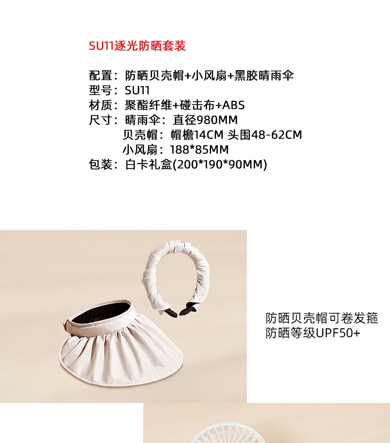 配置:防晒贝壳帽+小风扇+黑胶晴雨伞