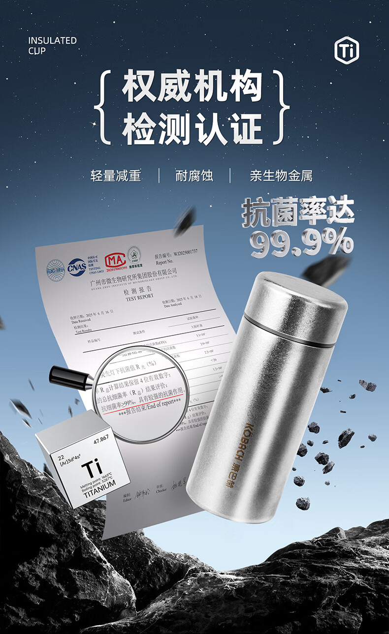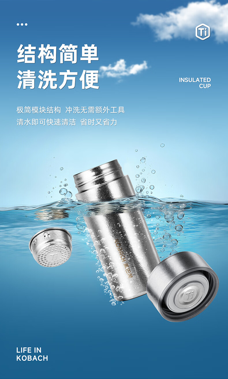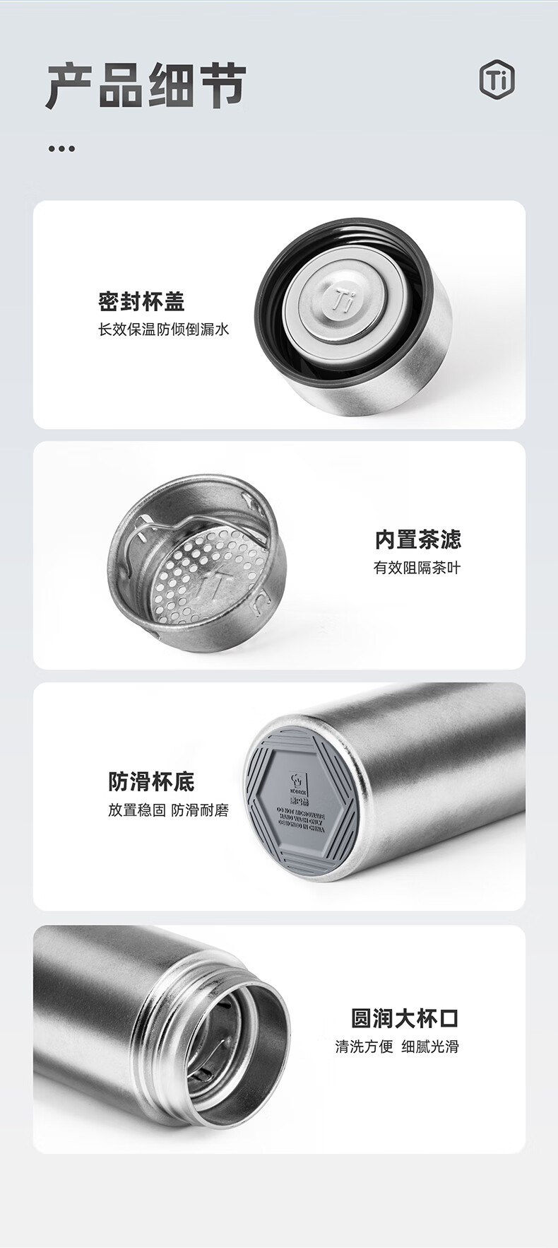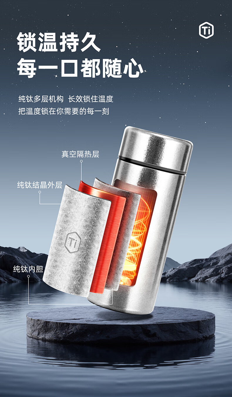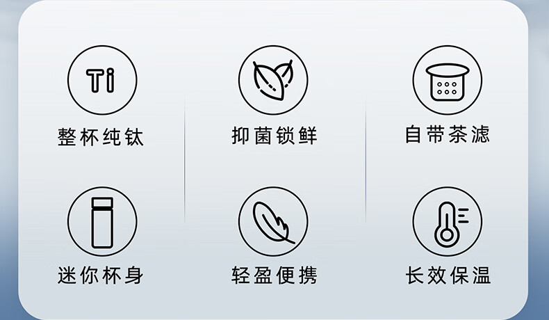 自带纯钛茶滤,茶水分离,密封杯盖;真空长效保温,纯钛杯体,轻盈便携;210ml小巧设计,携带方便