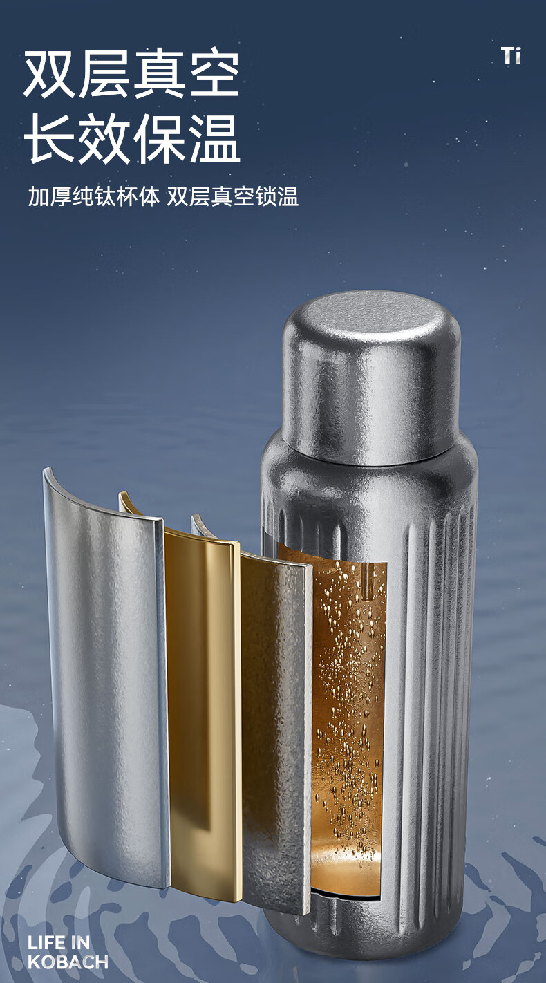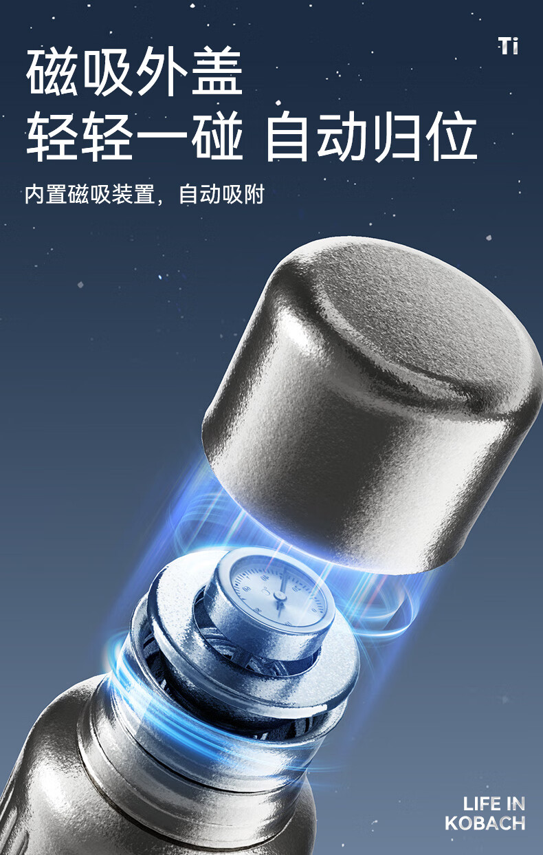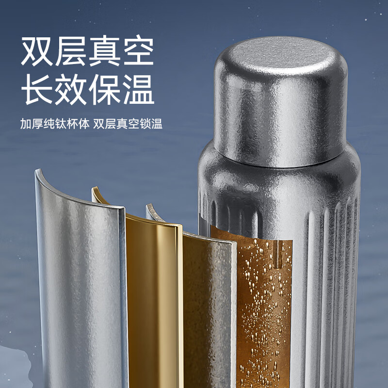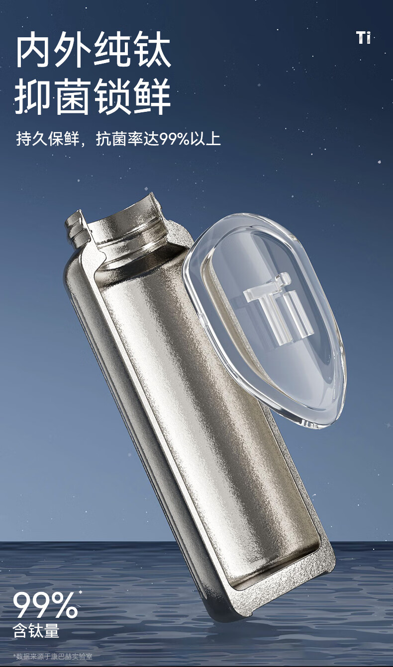 内外匀采用100%钛板材;磁吸分享外盖设计,紧密贴合,防漏抗摔;双层真空长效保温,加厚纯钛杯体,轻盈便携