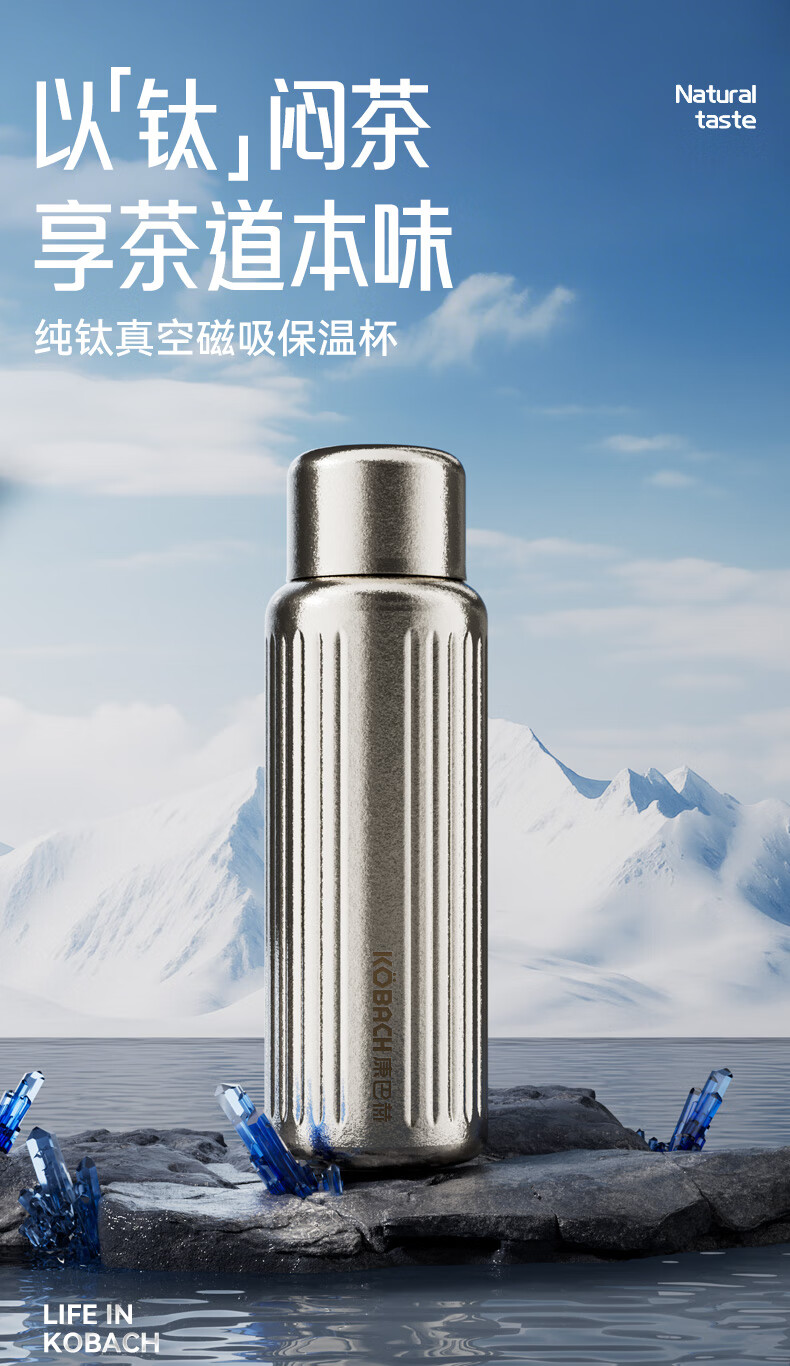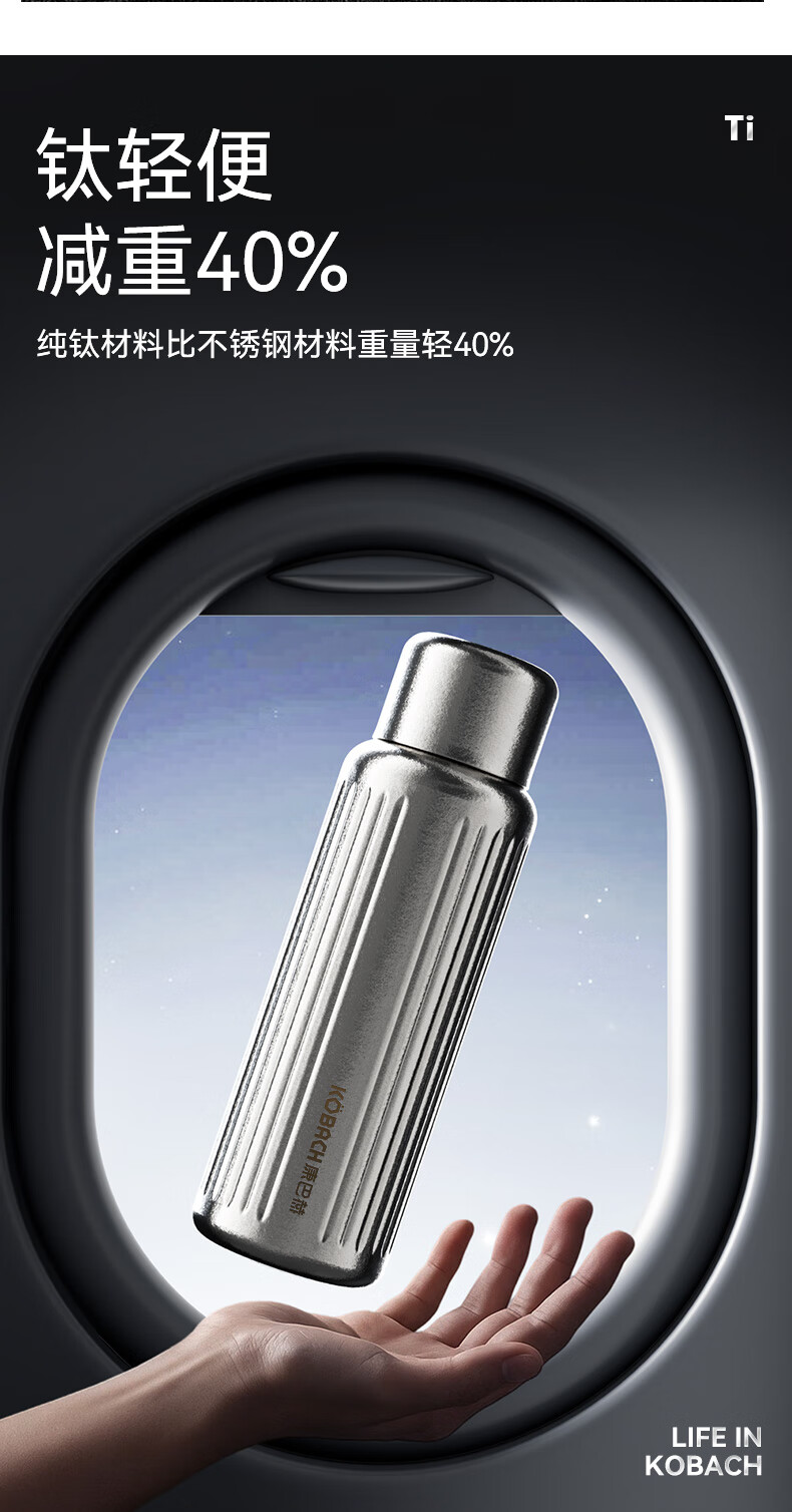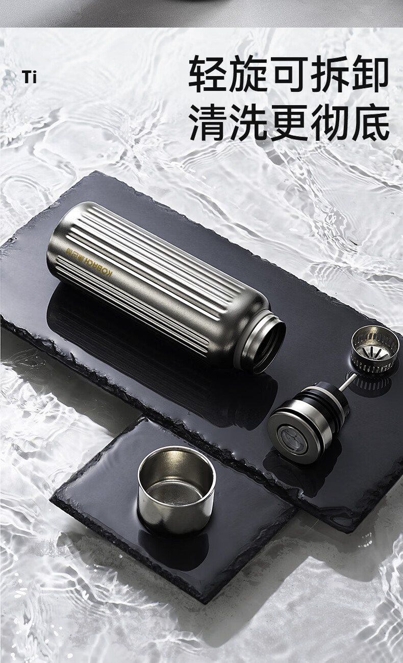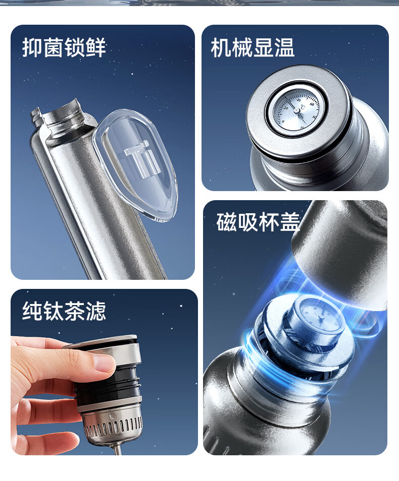 内外匀采用100%钛板材;磁吸分享外盖设计,紧密贴合,防漏抗摔;双层真空长效保温,加厚纯钛杯体,轻盈便携