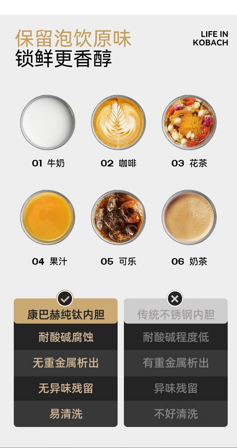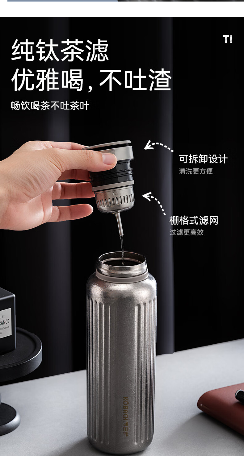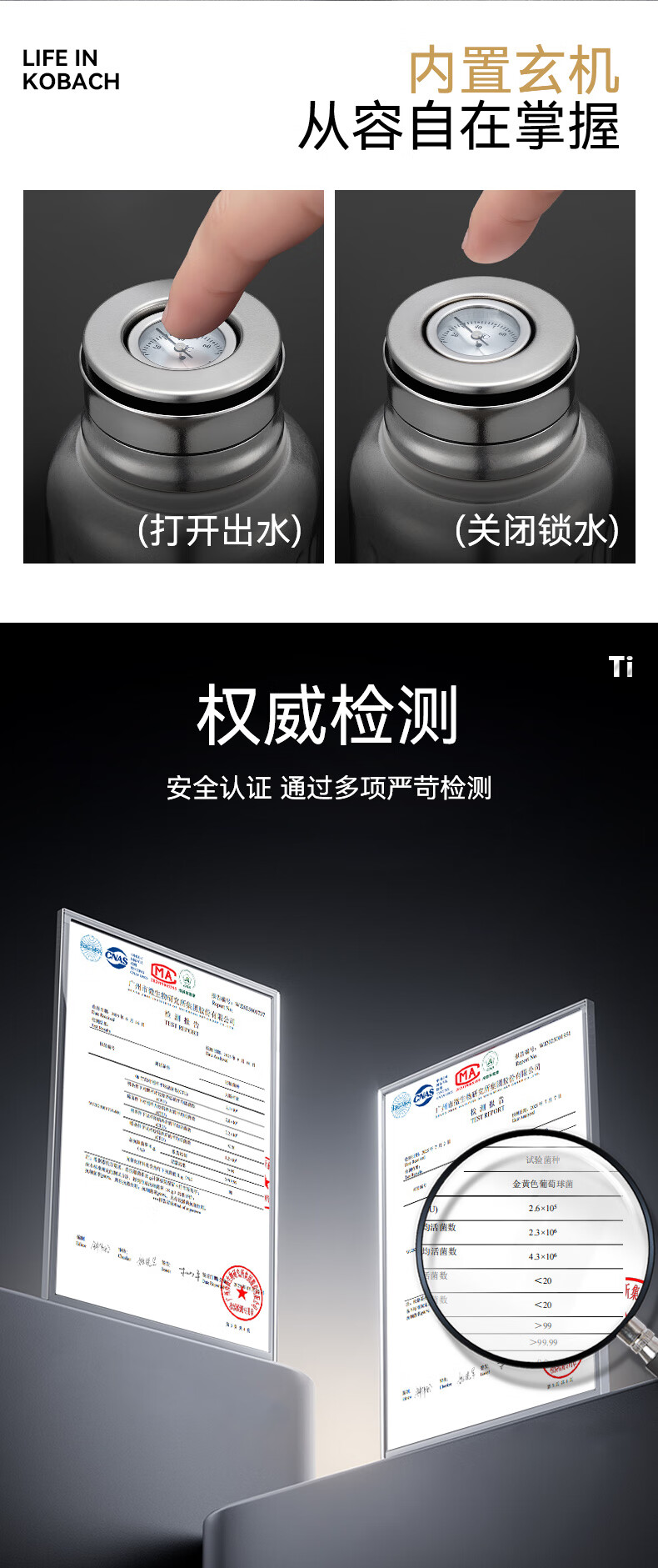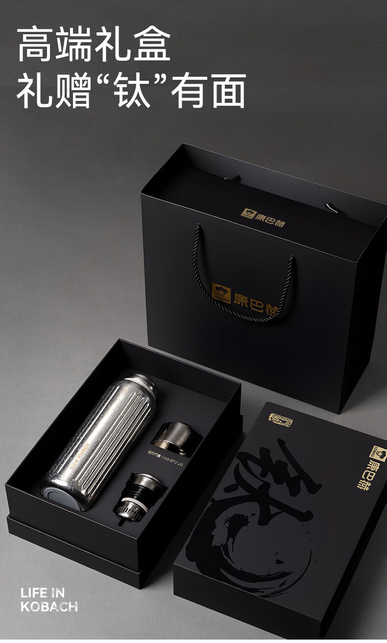 内外匀采用100%钛板材;磁吸分享外盖设计,紧密贴合,防漏抗摔;双层真空长效保温,加厚纯钛杯体,轻盈便携