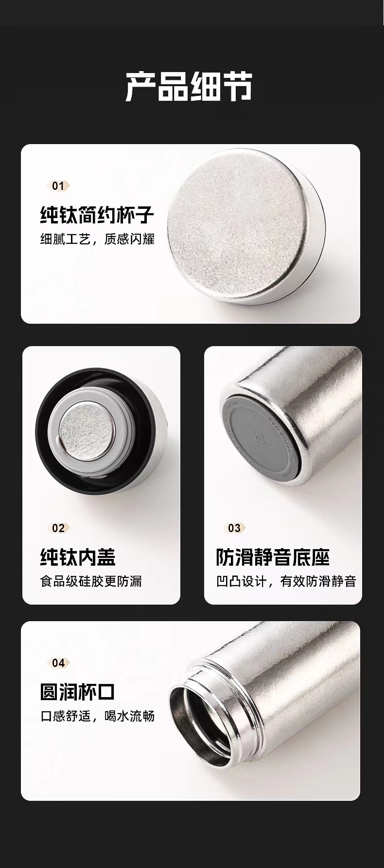 真空隔热 长效保温;超轻手感携带无忧;内外双层 纯钛材质