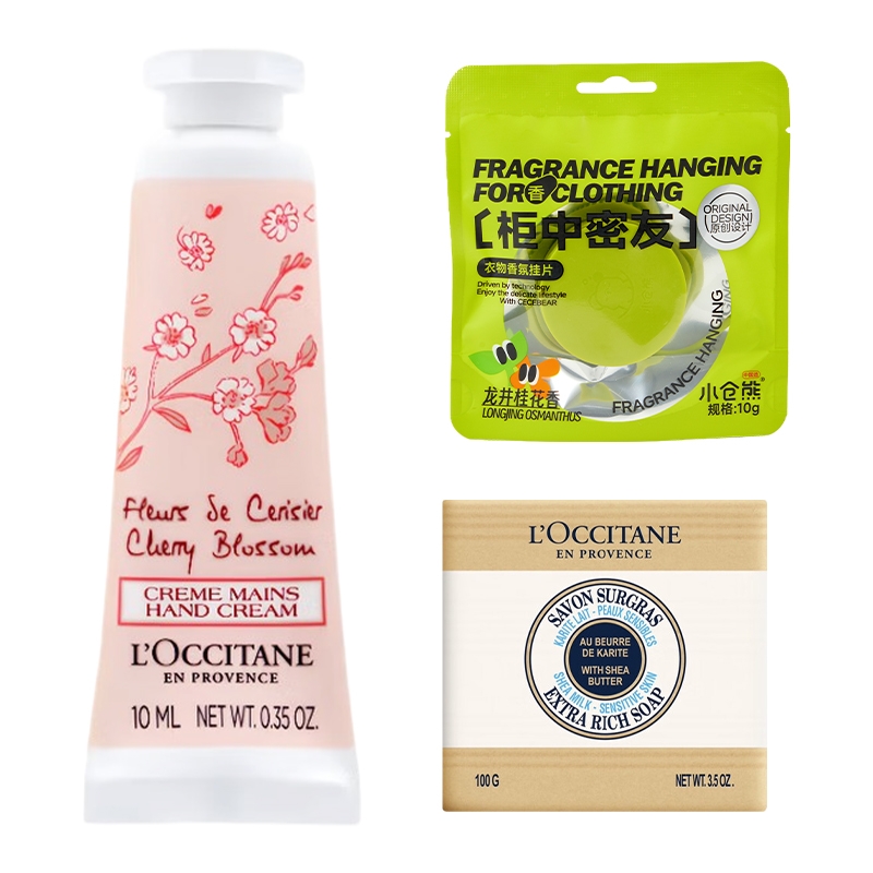 配置清单:欧舒丹乳木果牛奶味洁肤皂100g*1 欧舒丹甜蜜樱花香氛沐浴啫喱35ml*1 欧舒丹甜蜜樱花香氛亮采润肤乳35ml*1 欧舒丹甜蜜樱花香氛护手霜10ml*1 小仓熊衣物香氛挂片(龙井桂花香) 欧舒丹精美礼盒礼袋 *1
