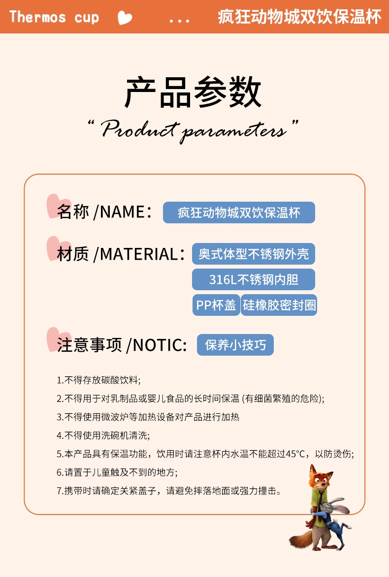 迪士尼 疯狂动物城2咖啡保温杯