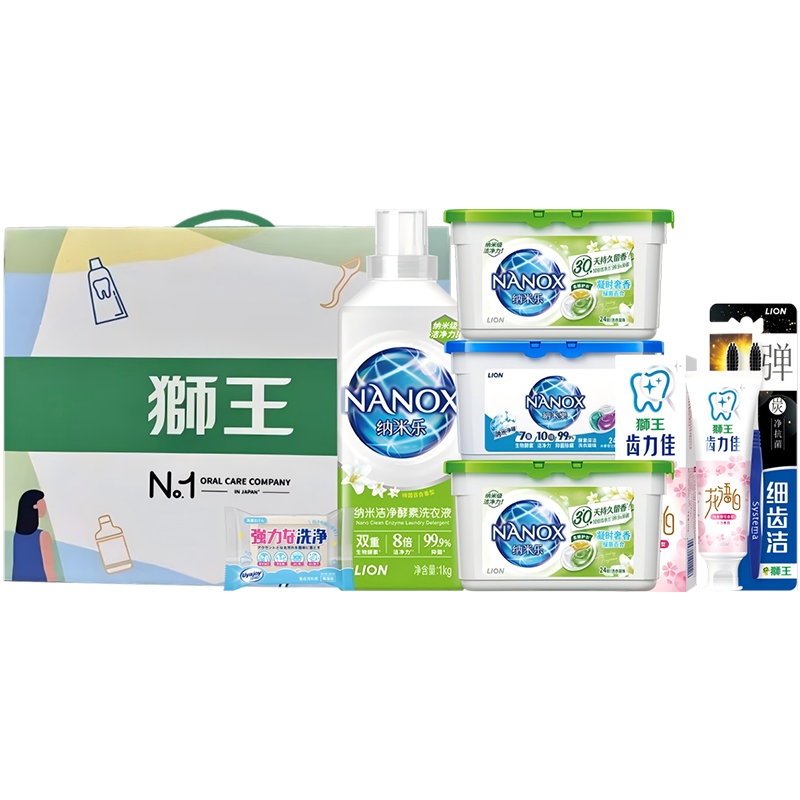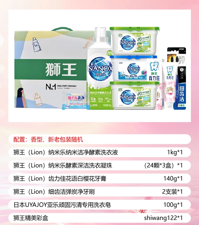 配置清单:狮王(Lion)纳米乐纳米洁净酵素洗衣液1kg*1 狮王(Lion)纳米乐酵素深洁洗衣凝珠(24颗*3盒)*1 狮王(Lion)齿力佳花语白樱花牙膏140g*1 狮王(Lion)细齿洁弹炭净牙刷2支装*1 日本UYAJOY亚乐顽固污清专用洗衣皂100g*1 狮王精美彩盒shiwang122*1