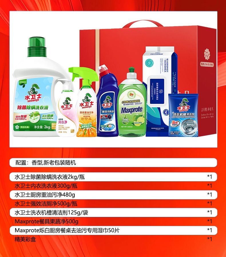 配置清单:水卫士除菌除螨洗衣液2kg/瓶*1 水卫士内衣洗衣液300g/瓶*1 水卫士厨房重油污净480g*1 水卫士强效洁厕净500g/瓶*1 水卫士洗衣机槽清洁剂125g/袋*1 Maxprote餐具果蔬净500g*1 Maxprote烁白厨房餐桌去油污专用湿巾50片*1 精美彩盒*1