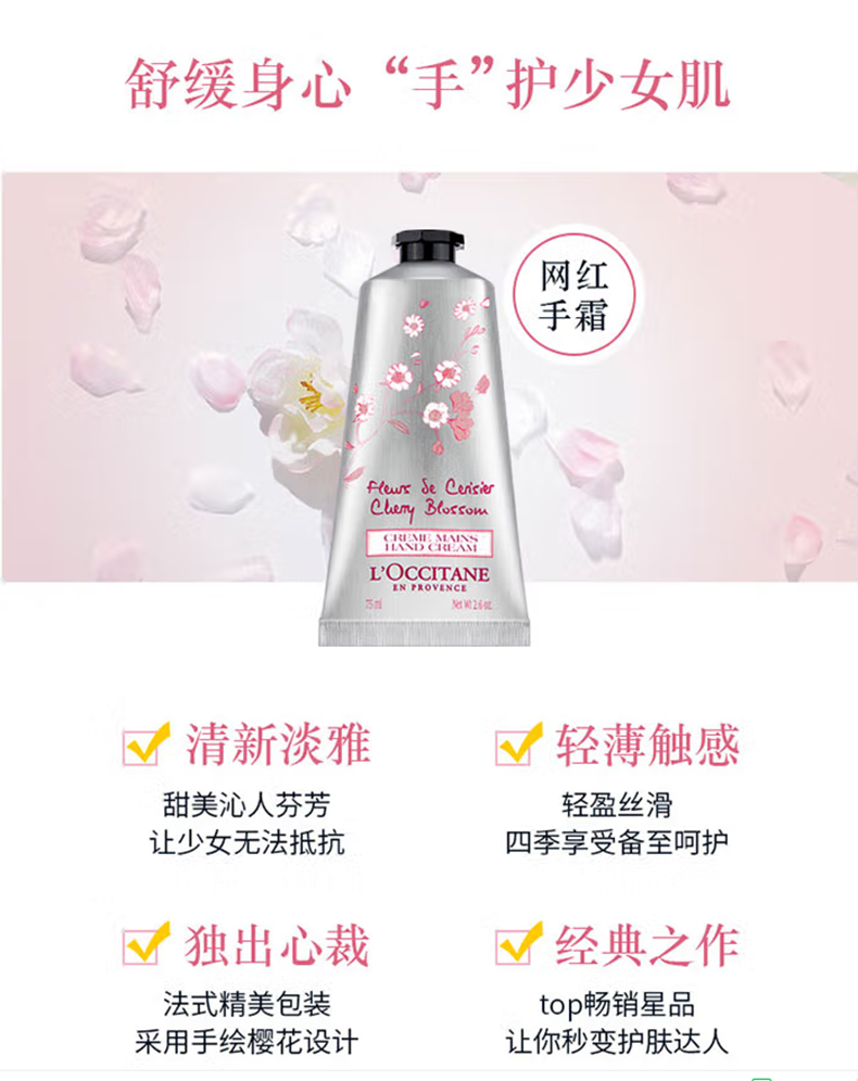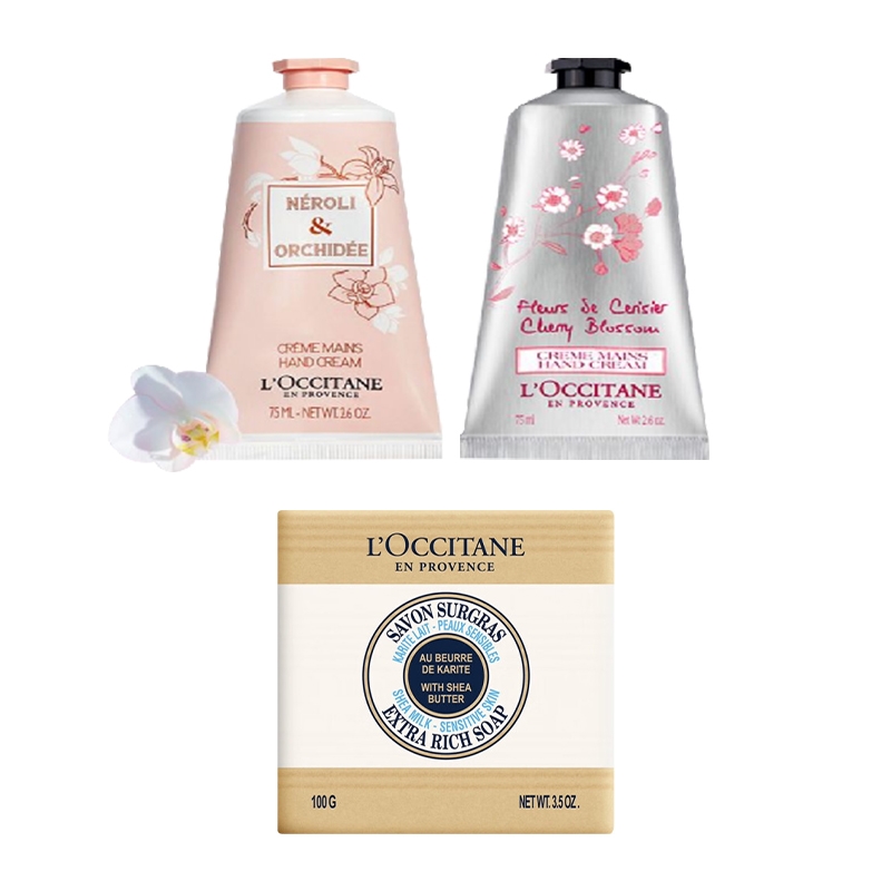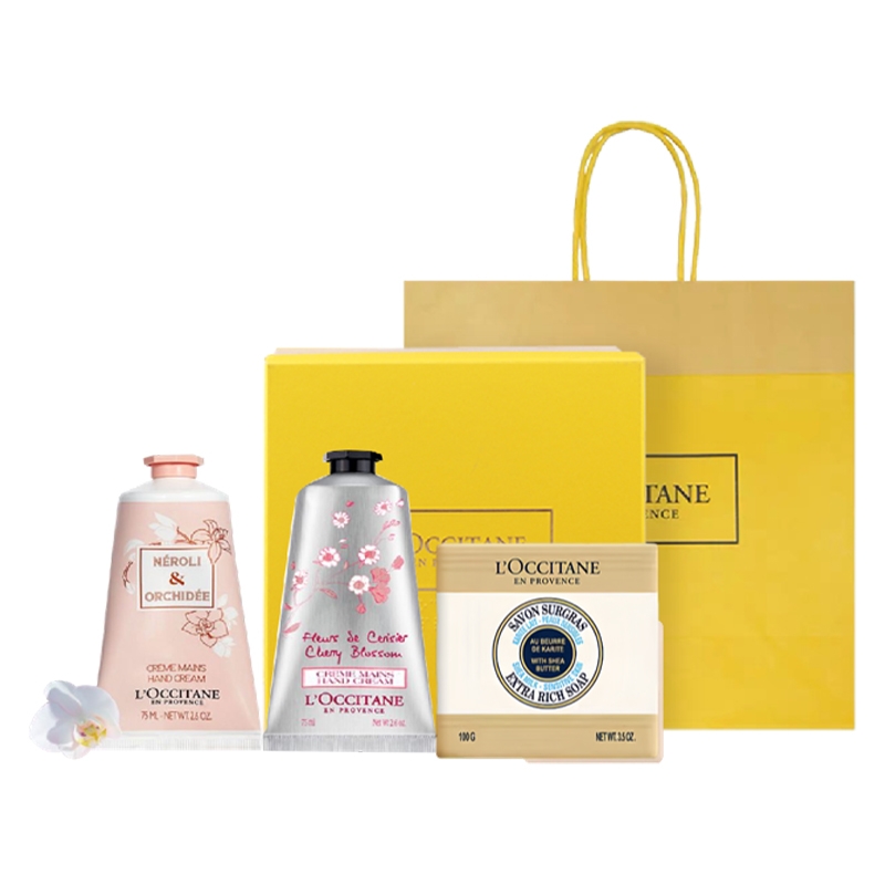 配置清单:欧舒丹乳木果牛奶味洁肤皂100g*1 欧舒丹甜蜜樱花护手霜75ml*1 欧舒丹格拉斯橙花护手霜75ml*1 欧舒丹精美礼盒礼袋*1