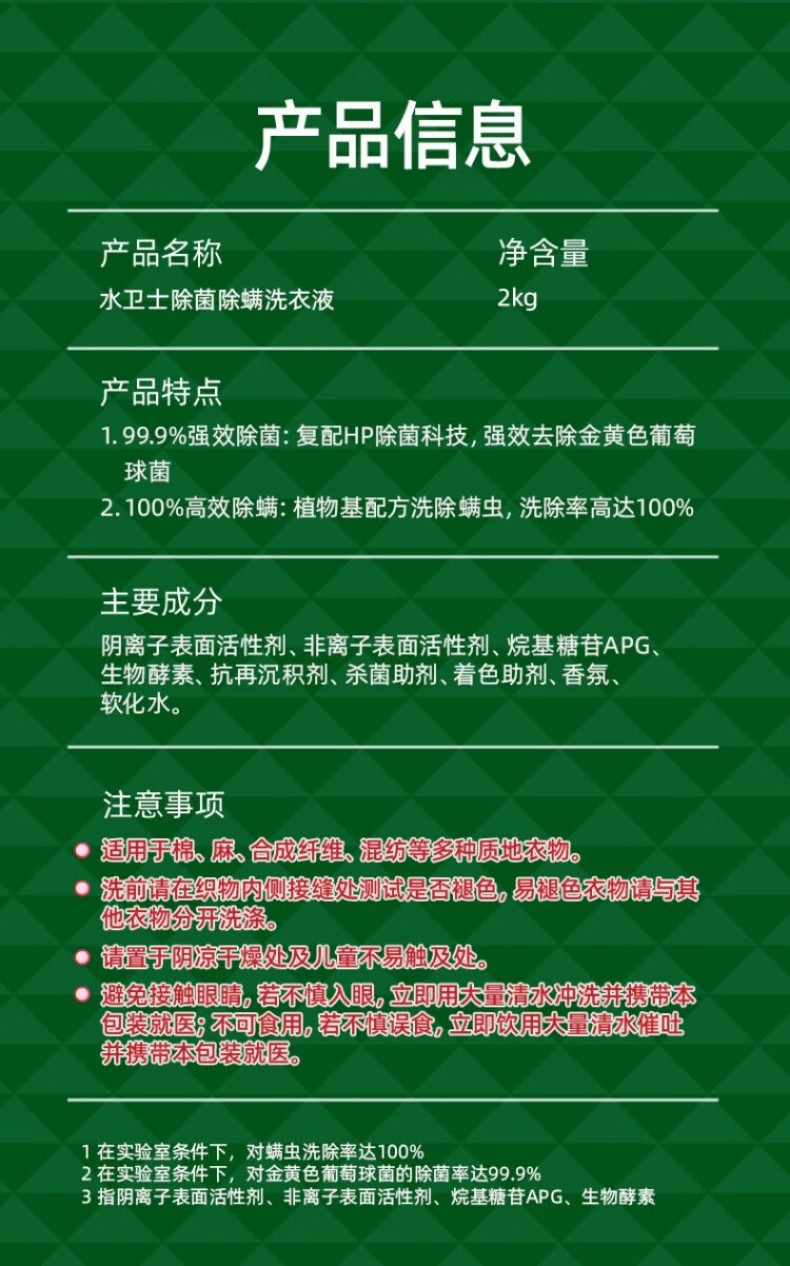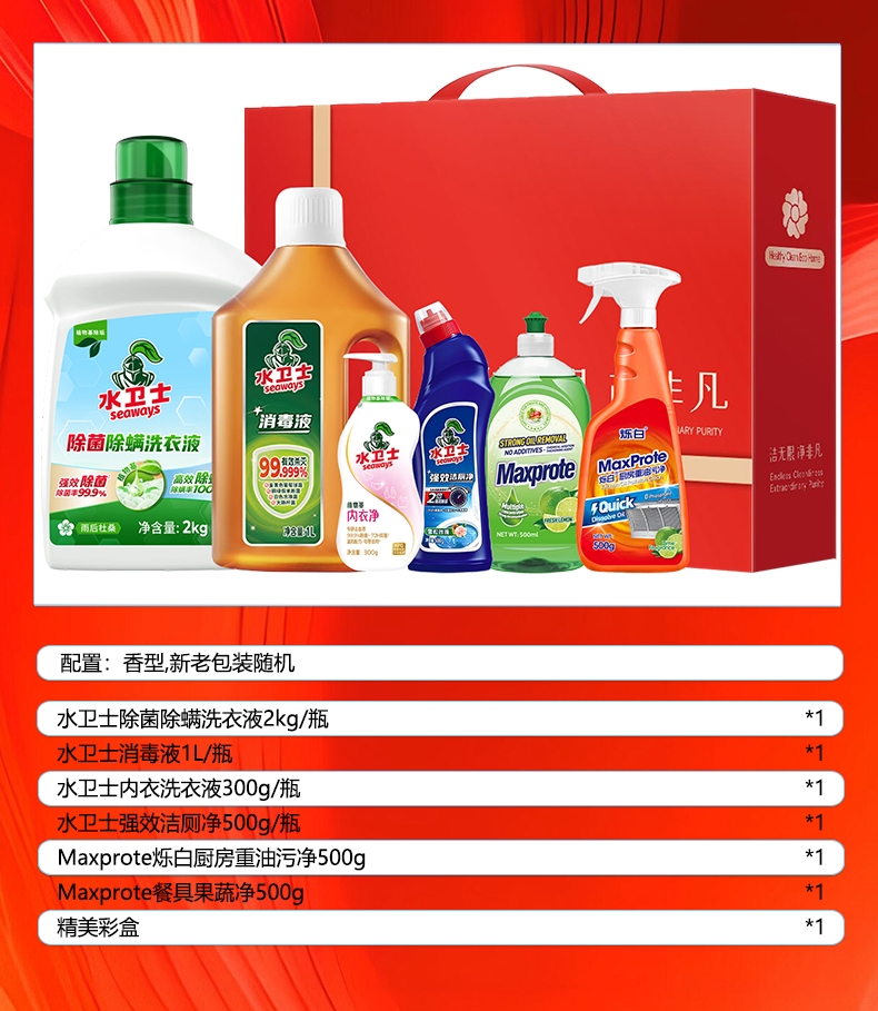 配置清单:水卫士除菌除螨洗衣液2kg/瓶*1 水卫士消毒液1L/瓶*1 水卫士内衣洗衣液300g/瓶*1 水卫士强效洁厕净500g/瓶*1 Maxprote烁白厨房重油污净500g*1 Maxprote餐具果蔬净500g*1 精美彩盒*1