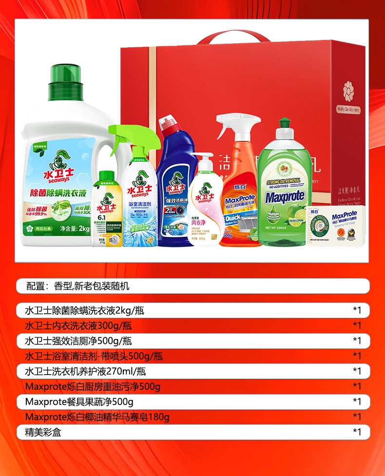 配置清单:水卫士除菌除螨洗衣液2kg/瓶*1 水卫士内衣洗衣液300g/瓶*1 水卫士强效洁厕净500g/瓶*1 水卫士浴室清洁剂-带喷头500g/瓶*1 水卫士洗衣机养护液270ml/瓶*1 Maxprote烁白厨房重油污净500g*1 Maxprote餐具果蔬净500g*1 Maxprote烁白椰油精华马赛皂180g*1 精美彩盒*1