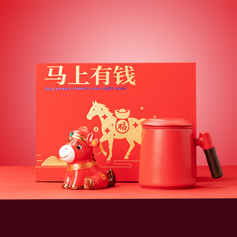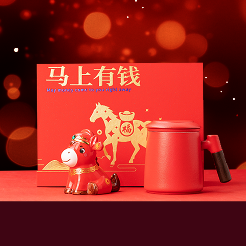 紧扣马年主题,“马上有钱” 谐音寓意讨喜;摆件与杯子均采用优质陶瓷,细腻温润、耐用易清洁;经典中国红搭配烫金元素,完美契合春节氛围,年味十足;配套精美贺卡,可定制专属祝福,让礼物更有情感价值;作为马年限定产品,具有独特的收藏与纪念意义