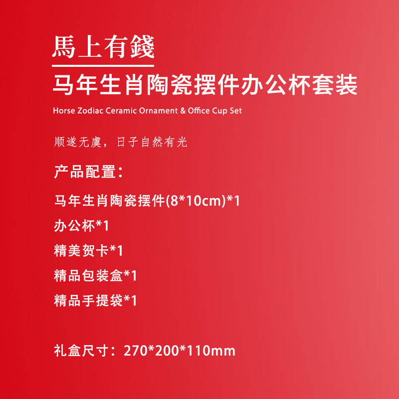 配置清单:马年生肖陶瓷摆件(8*10cm)*1 办公杯*1 精美贺卡*1 精品包装盒*1 精品手提袋*1