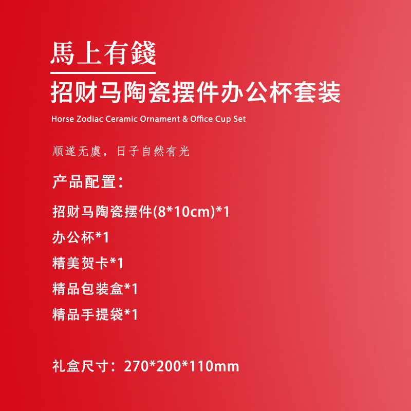 配置清单:招财马陶瓷摆件(8*10cm)*1 办公杯*1 精美贺卡*1 精品包装盒*1 精品手提袋*1