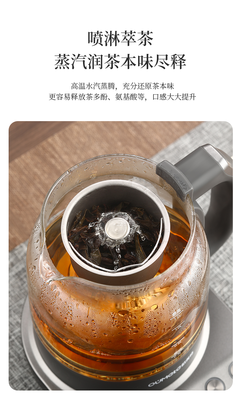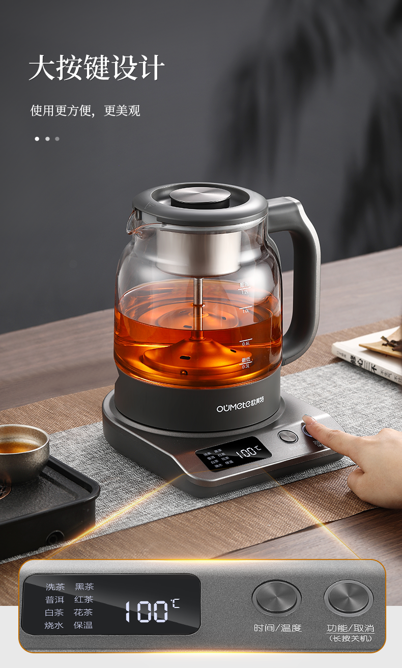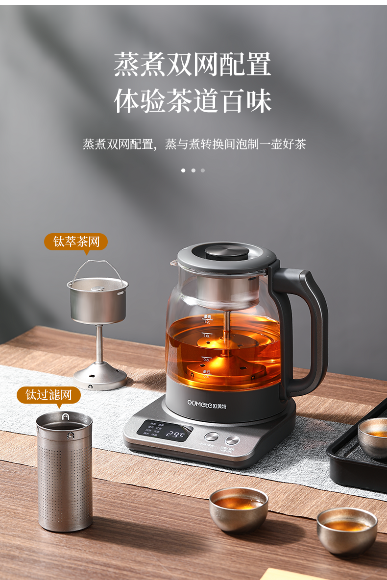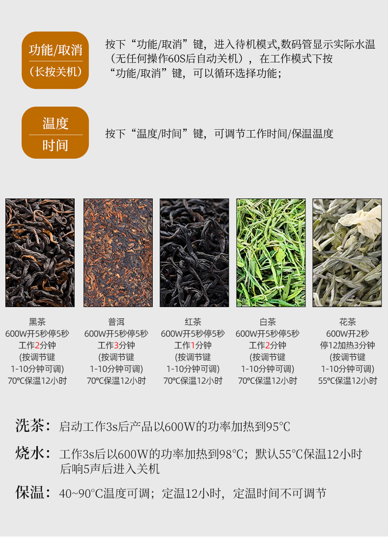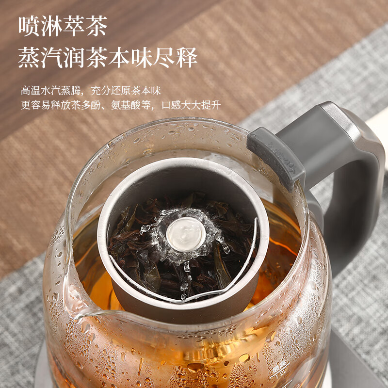 按键功能:洗茶、黑茶、普洱、红茶、白茶、花茶、烧水;钛材质发热盘、过滤网壶内盖;大容量设计1.2升大容量,满足多人需求;双网配置喷淋网+过滤网,满足多种需求