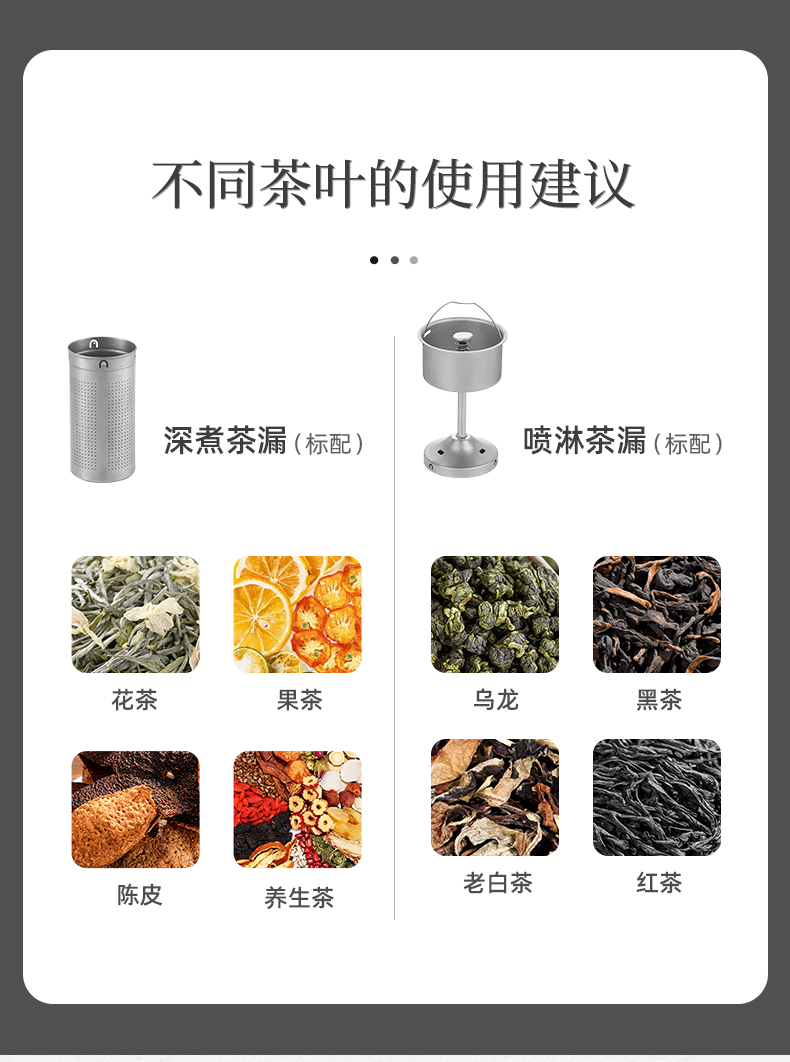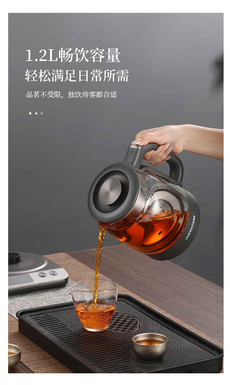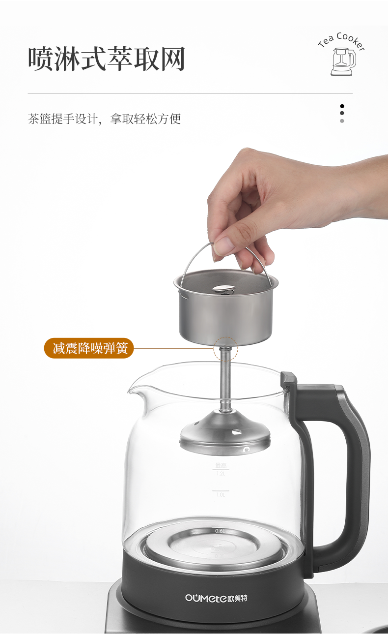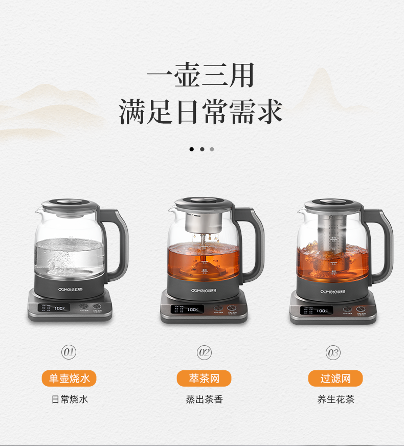 按键功能:洗茶、黑茶、普洱、红茶、白茶、花茶、烧水;钛材质发热盘、过滤网壶内盖;大容量设计1.2升大容量,满足多人需求;双网配置喷淋网+过滤网,满足多种需求