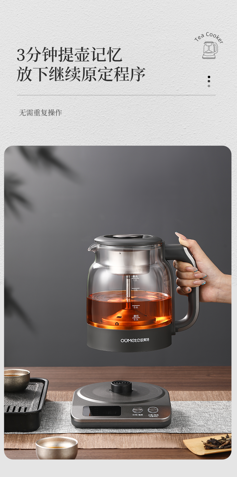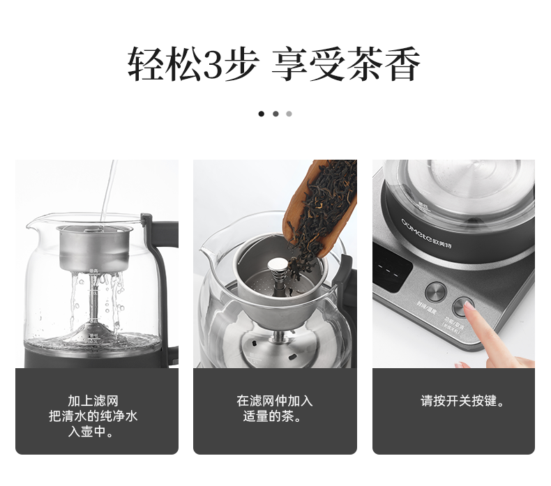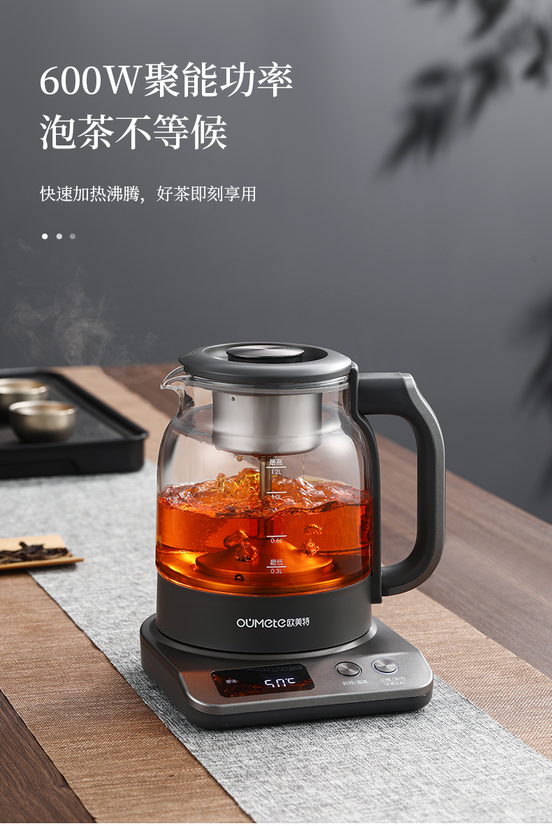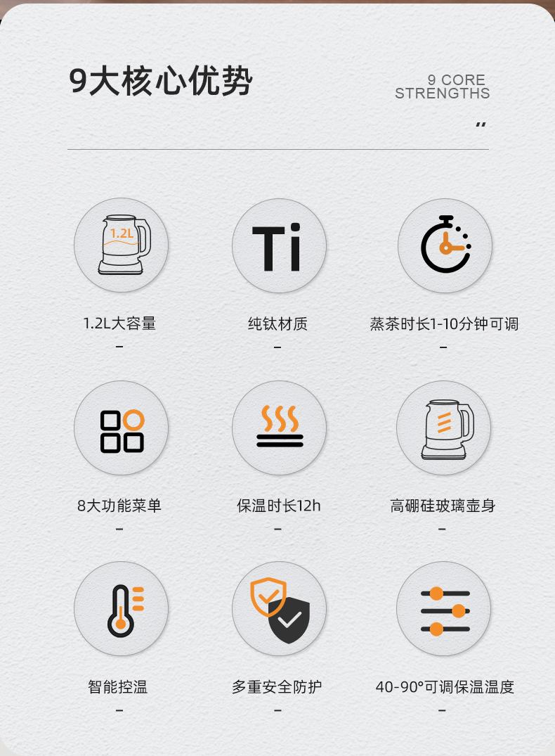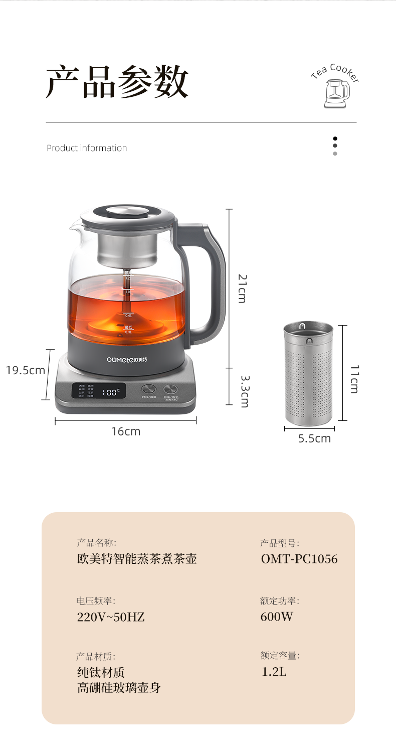按键功能:洗茶、黑茶、普洱、红茶、白茶、花茶、烧水;钛材质发热盘、过滤网壶内盖;大容量设计1.2升大容量,满足多人需求;双网配置喷淋网+过滤网,满足多种需求