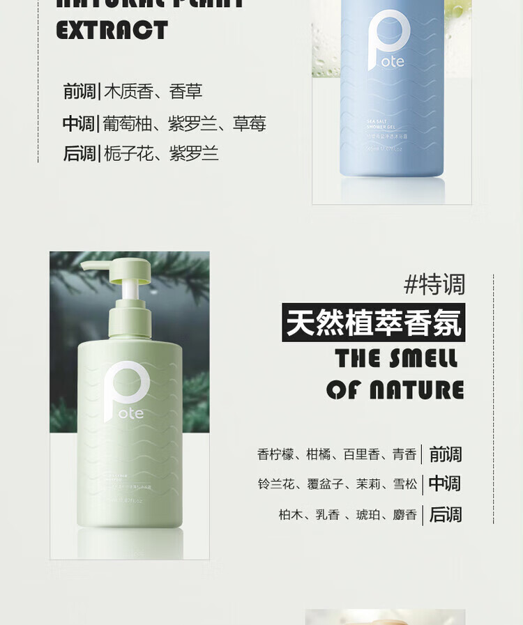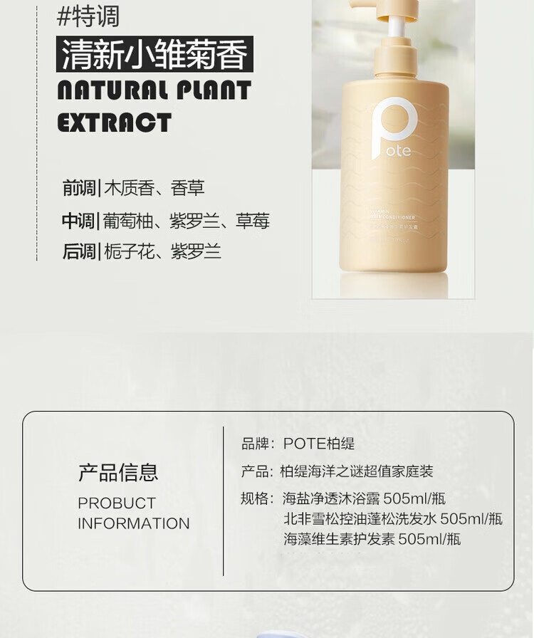 配置:海盐净透沐浴露 505ml/瓶北非雪松控油蓬松洗发水505ml/瓶海藻维生素护发素505ml/瓶