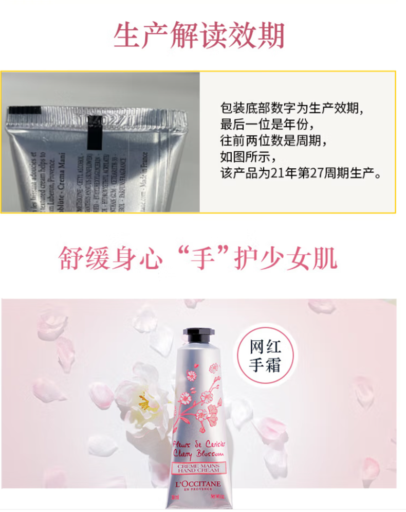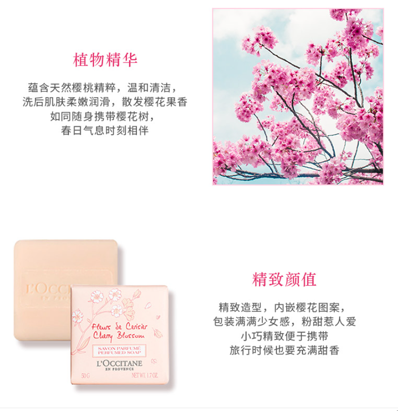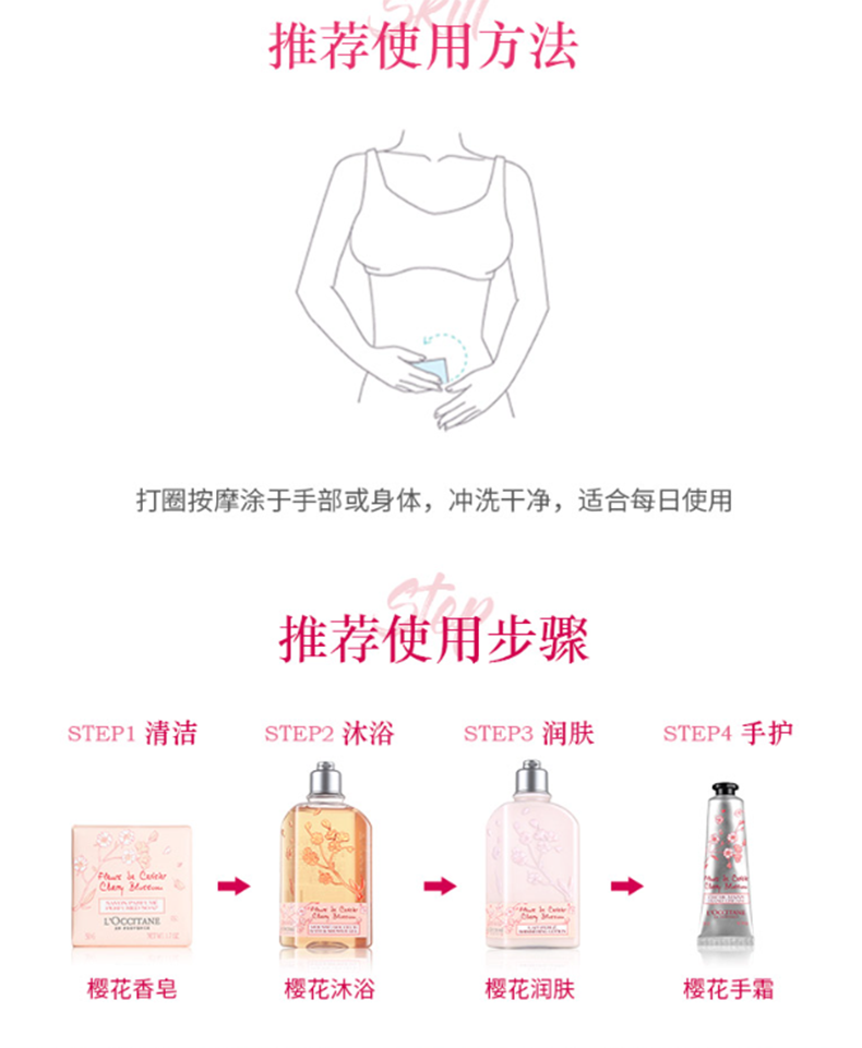配置清单:欧舒丹樱花沐浴啫喱250ml*1 欧舒丹樱花亮采润肤露 250ml*1 欧舒丹甜蜜樱花护手霜30ml*1 欧舒丹甜蜜樱花香氛皂50g*1 欧舒丹精美礼盒礼袋*1