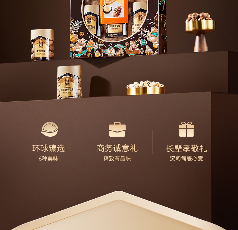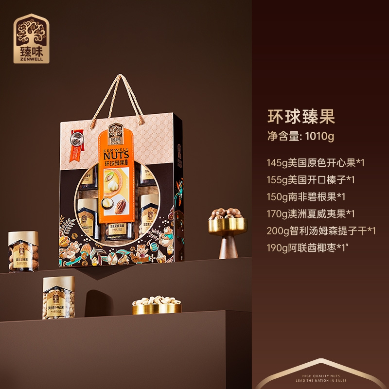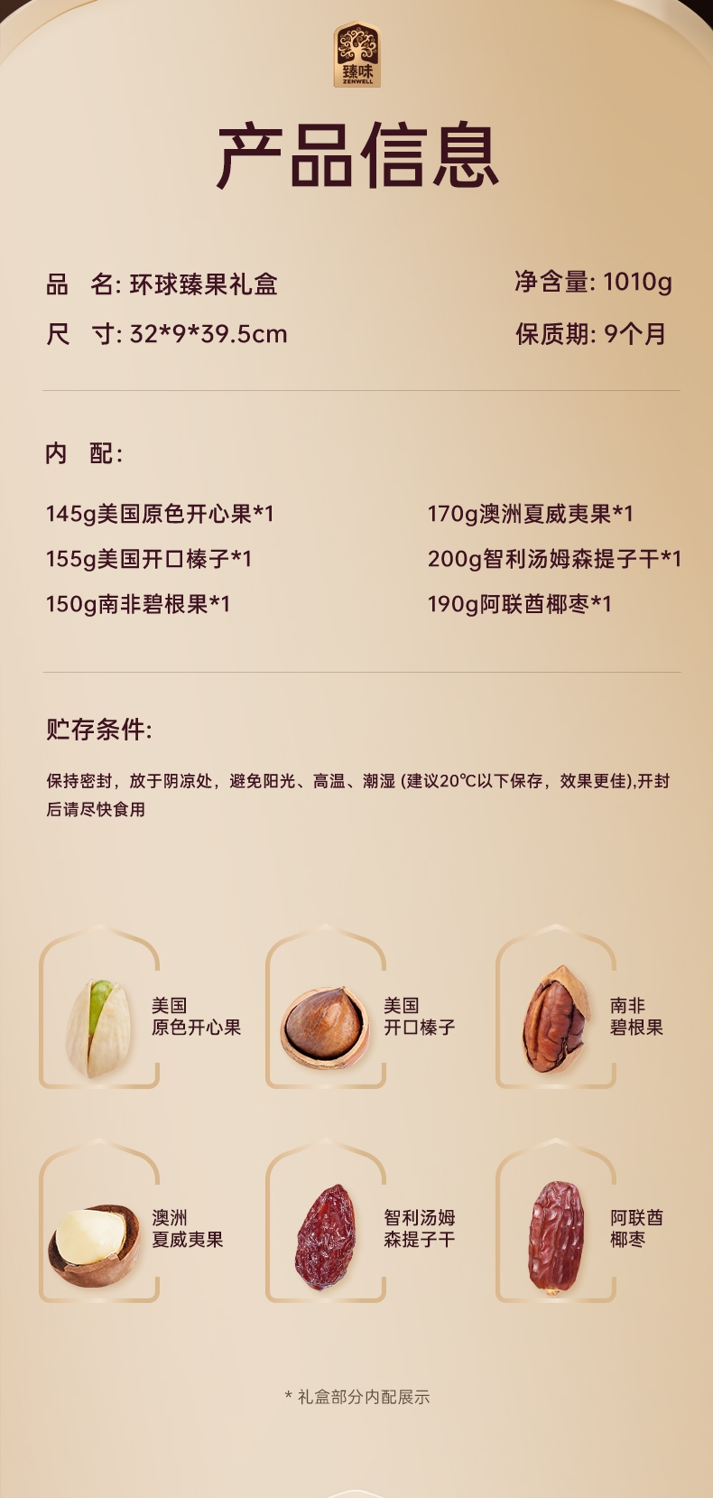 配置清单:1、臻味145g美国原色开心果*1 2、臻味155g美国开口榛子*1 3、臻味150g南非碧根果*1 4、臻味170g澳洲夏威夷果*1 5、臻味200g智利汤姆森提子干*1 6、臻味190g阿联酋椰枣*1