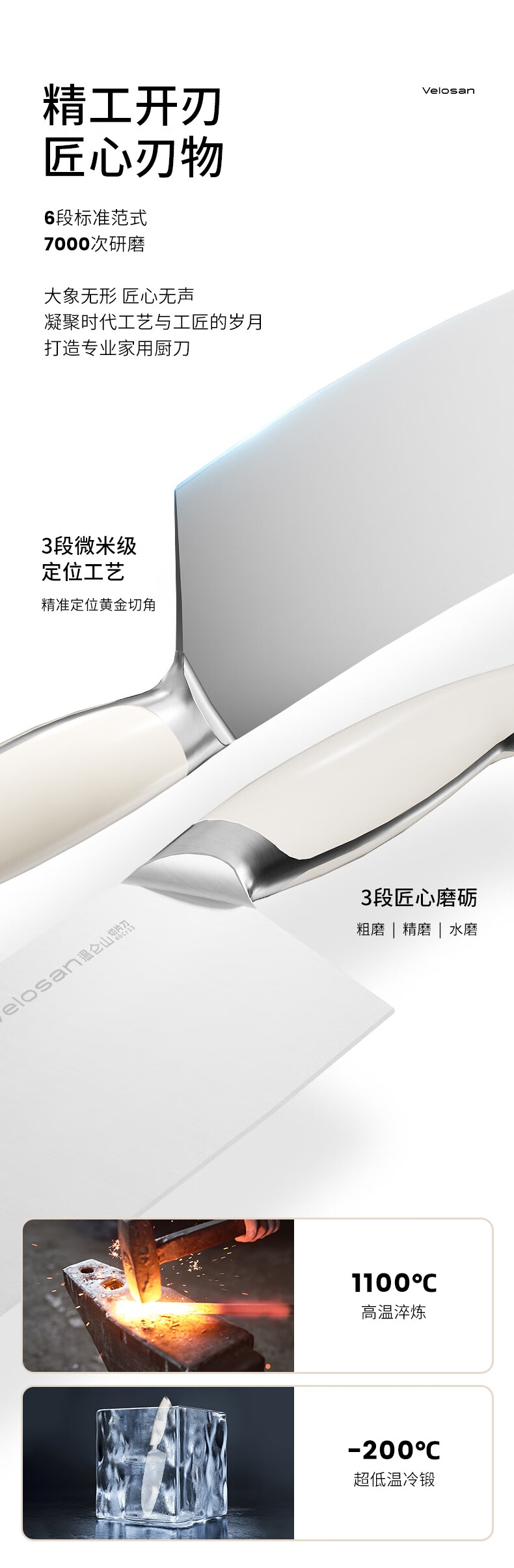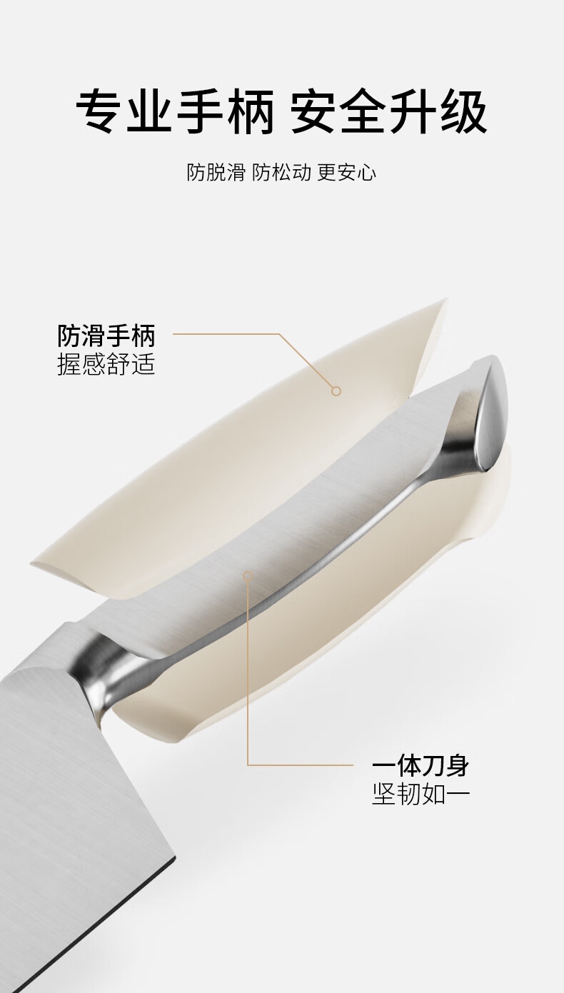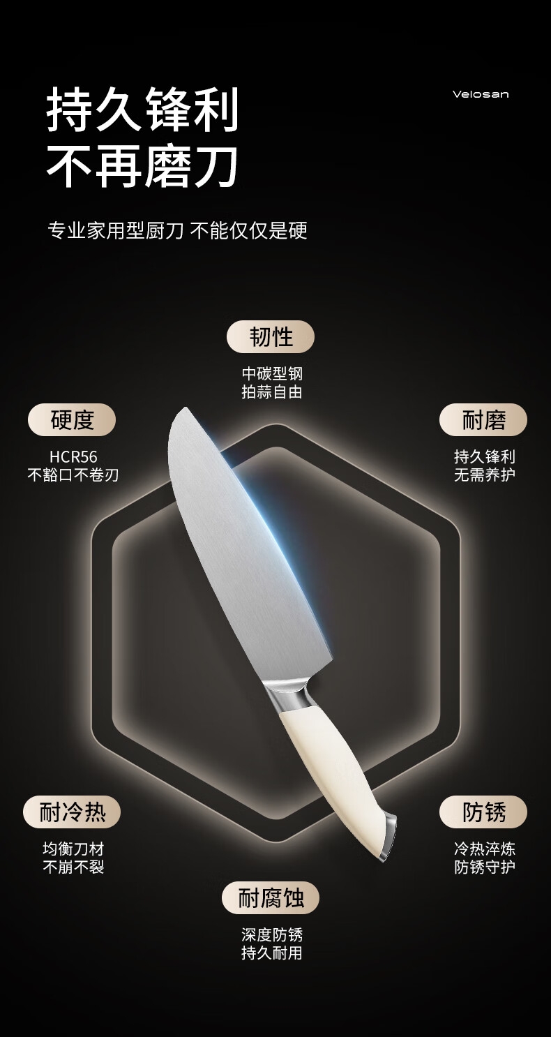高品质中碳不锈钢,持久锋利;抗菌率99%,安全卫生 PVD磁控技术处理,;物理防锈; 黄金15°V型,超切快感