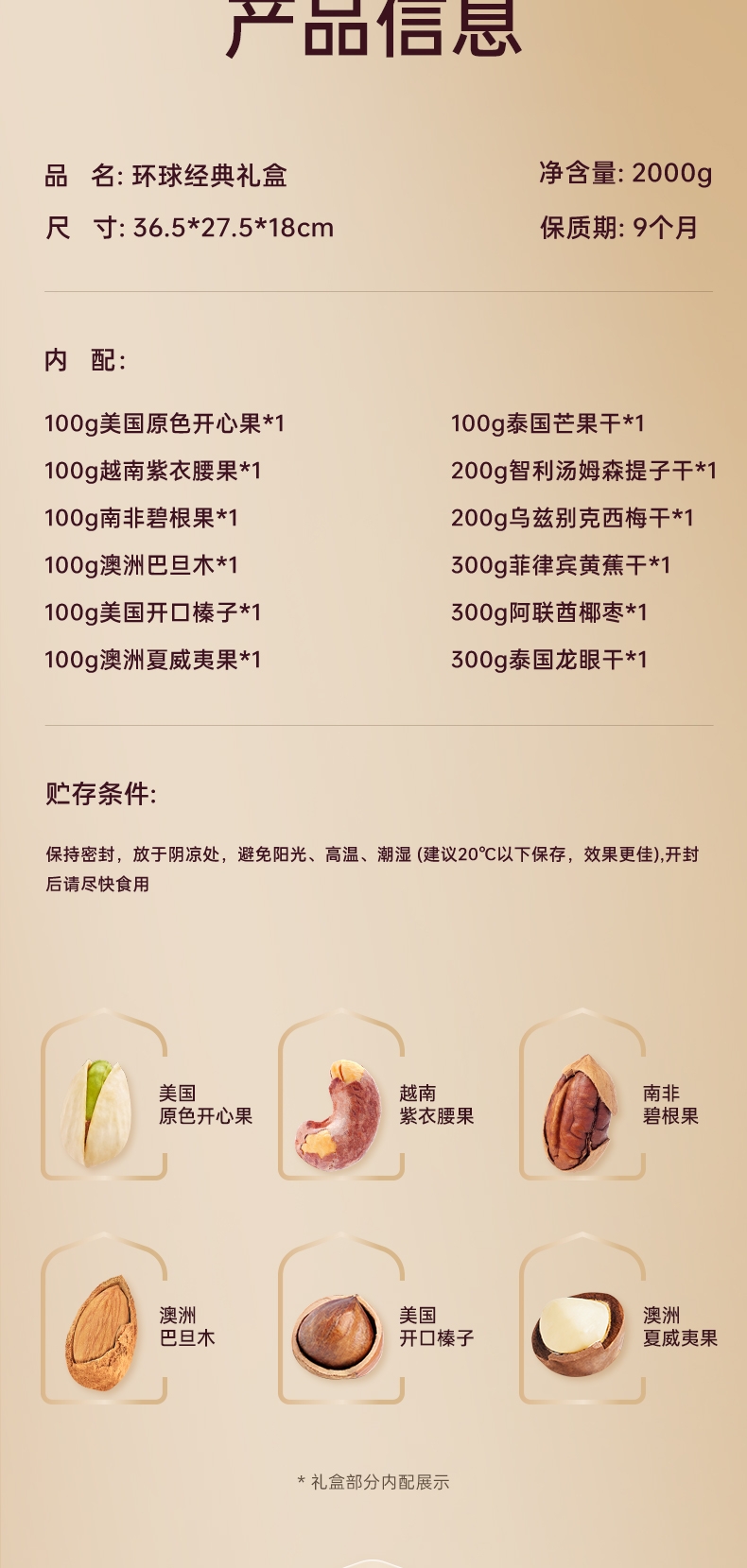 配置清单:1、臻味100g美国原色开心果*1 2、臻味100g越南紫衣腰果*1 3、臻味100g南非碧根果*1 4、臻味100g澳洲巴旦木*1 5、臻味100g美国开口榛子*1 6、臻味100g澳洲夏威夷果*1 7、臻味100g泰国芒果干*1 8、臻味200g智利汤姆森提子干*1 9、臻味200g乌兹别克西梅干*1 10、臻味300g菲律宾黄蕉干*1 11、臻味300g阿联酋椰枣*1 12、臻味300g泰国龙眼干*1