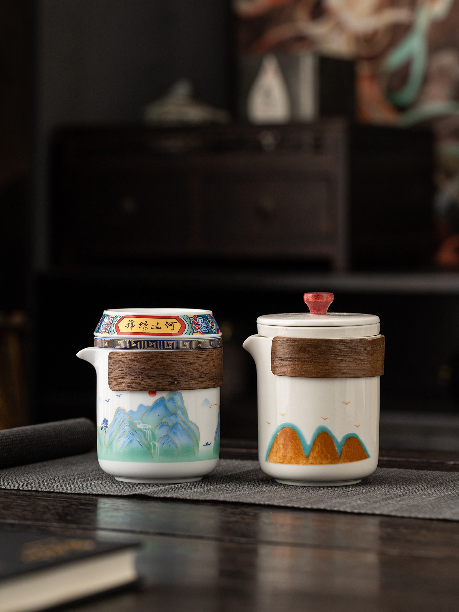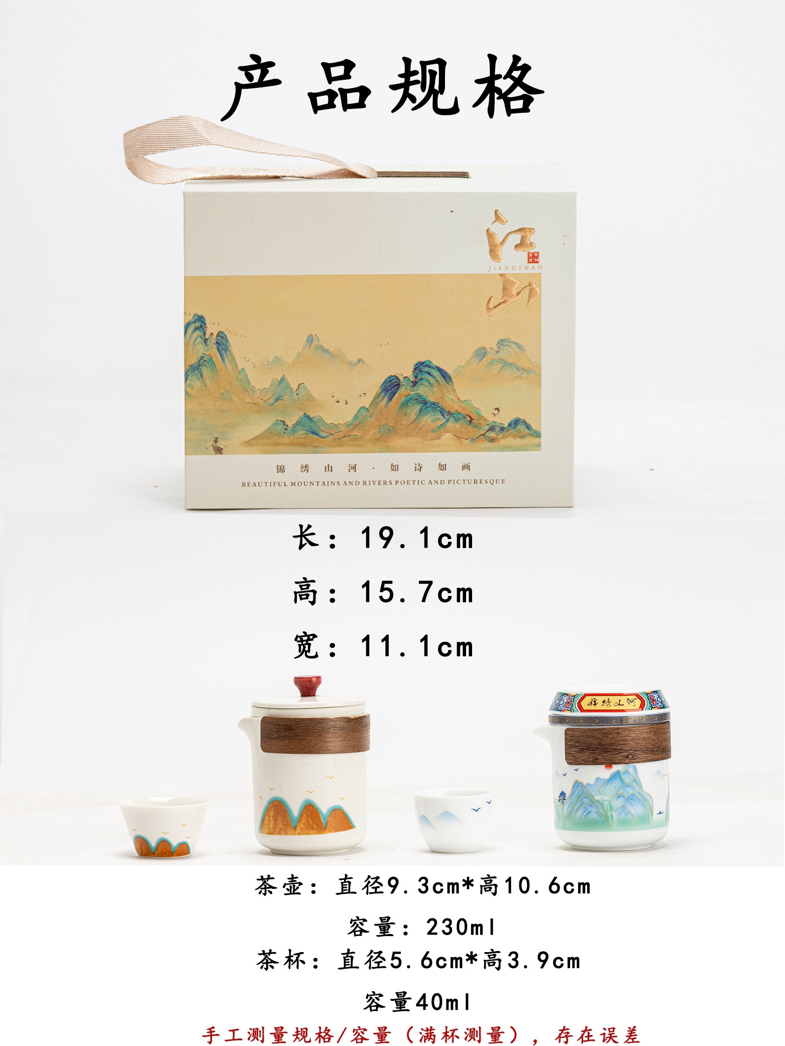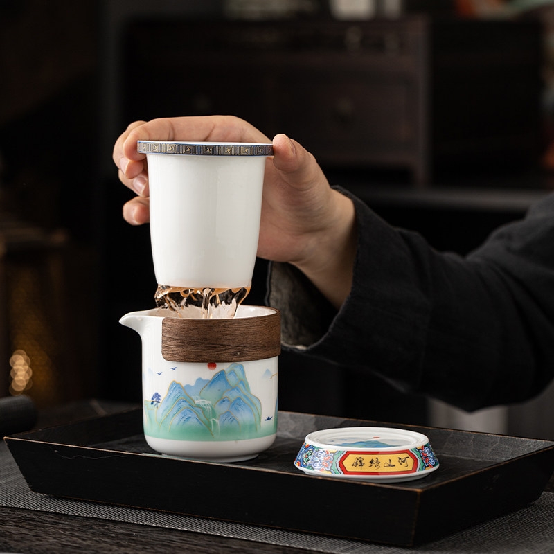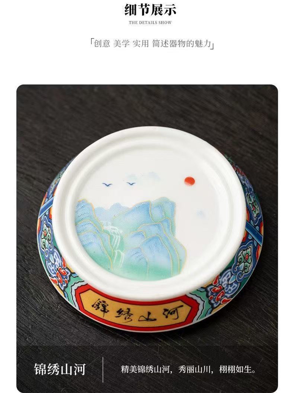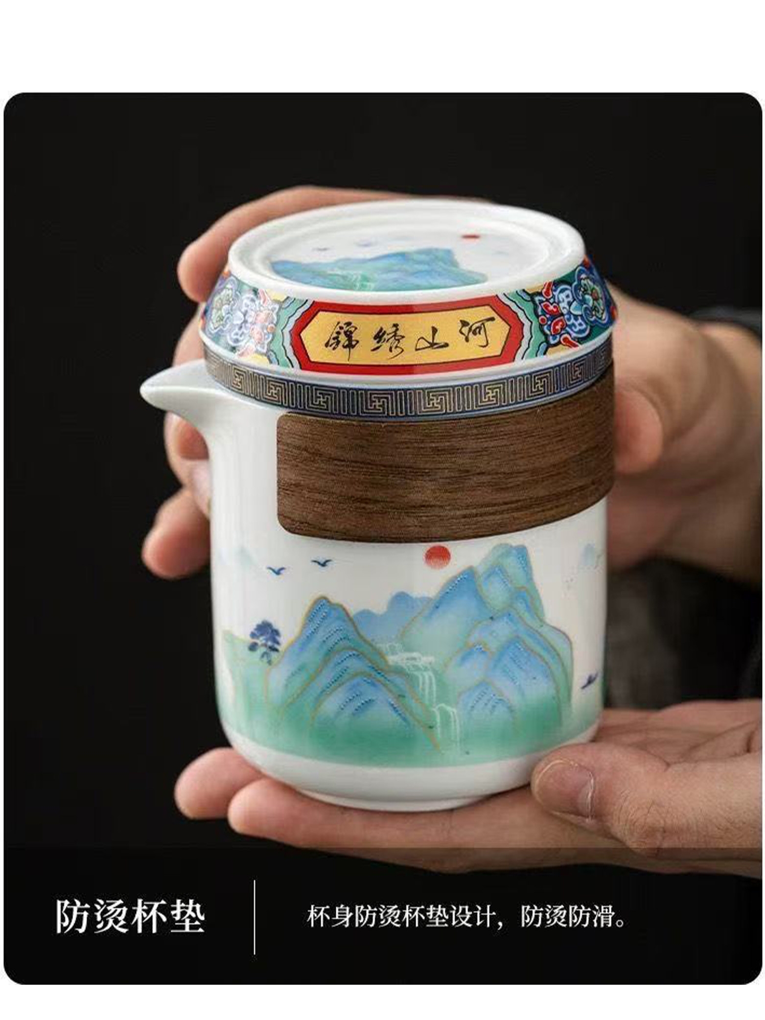 缜密全瓷材质过滤,轻松茶水分离;杯身防烫杯垫设计,防烫防滑;精美锦绣山河,秀丽山川,栩栩如生