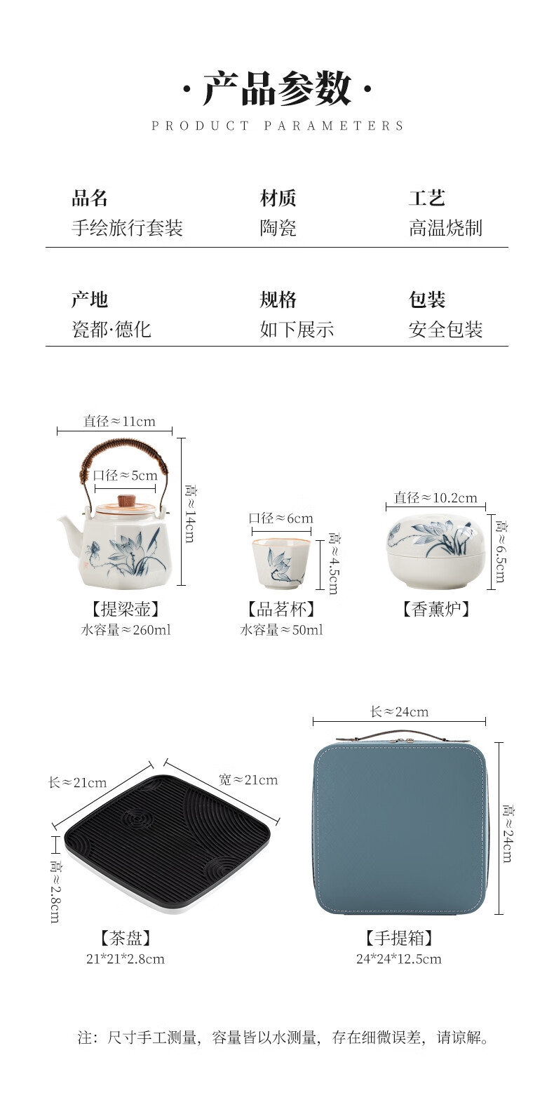 配置:提梁壶1茶杯*6 香薰炉*1茶盘1手提箱1