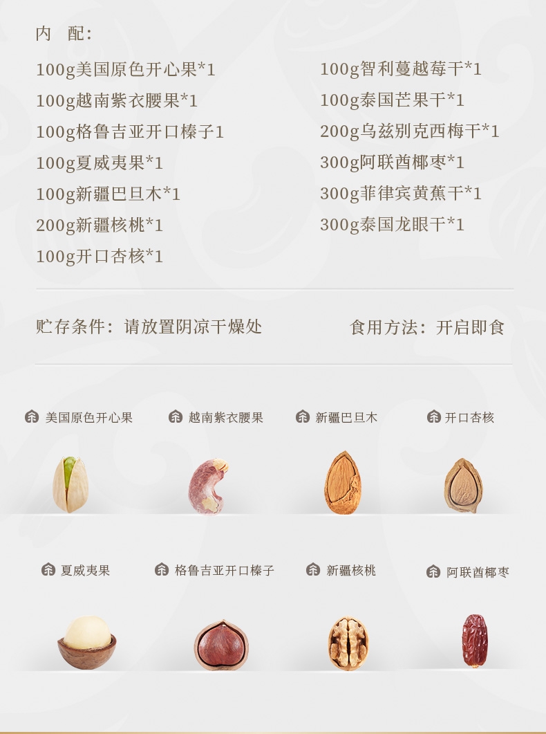 配置清单:1、臻味100g美国原色开心果*1 2、臻味100g越南紫衣腰果*1 3、臻味100g格鲁吉亚开口榛子1 4、臻味100g夏威夷果*1 5、臻味100g新疆巴旦木*1 6、臻味200g新疆核桃*1 7、臻味100g开口杏核*1 8、臻味100g智利蔓越莓干*1 9、臻味100g泰国芒果干*1 10、臻味200g乌兹别克西梅干*1 11、臻味300g阿联酋椰枣*1 12、臻味300g菲律宾黄蕉干*1 13、臻味300g泰国龙眼干*1