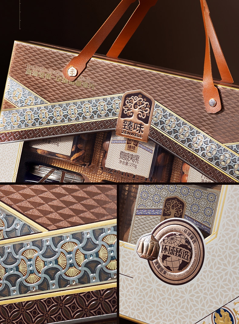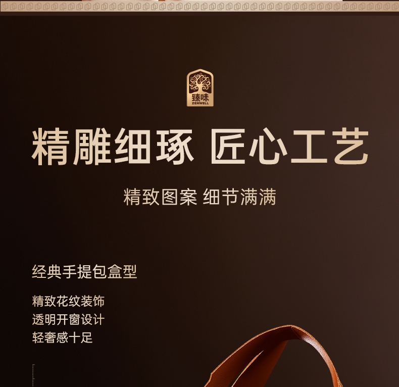 礼盒采用经典手提包盒型;搭配精致的花纹装饰与透明开窗设计;颜值在线,轻奢感十足