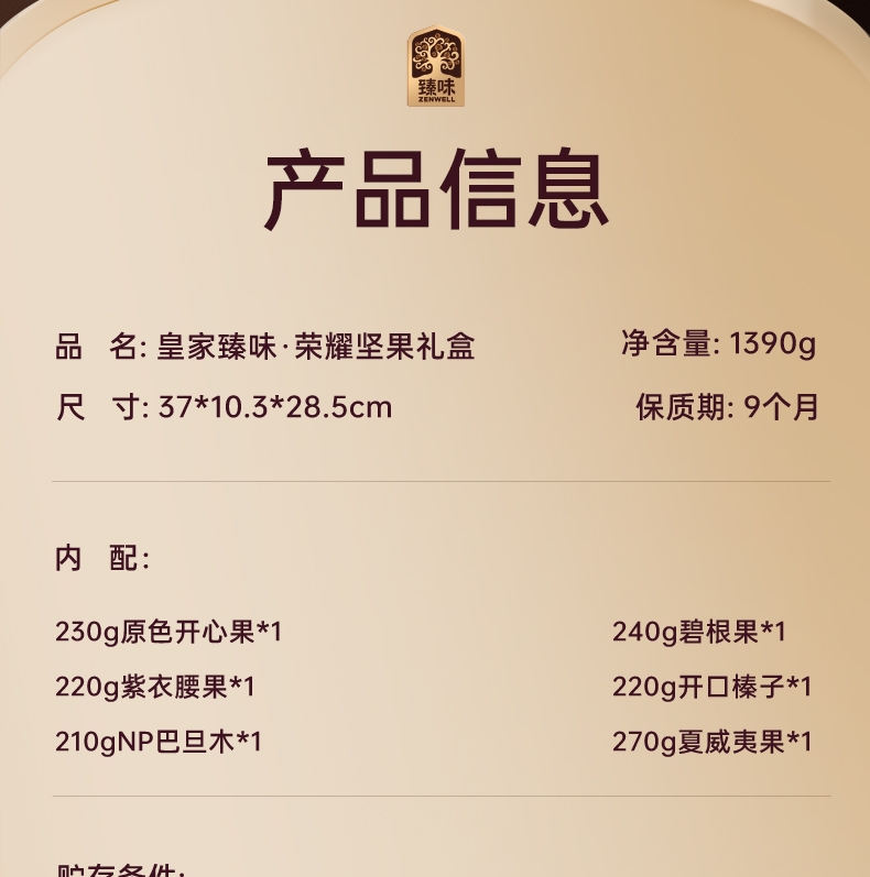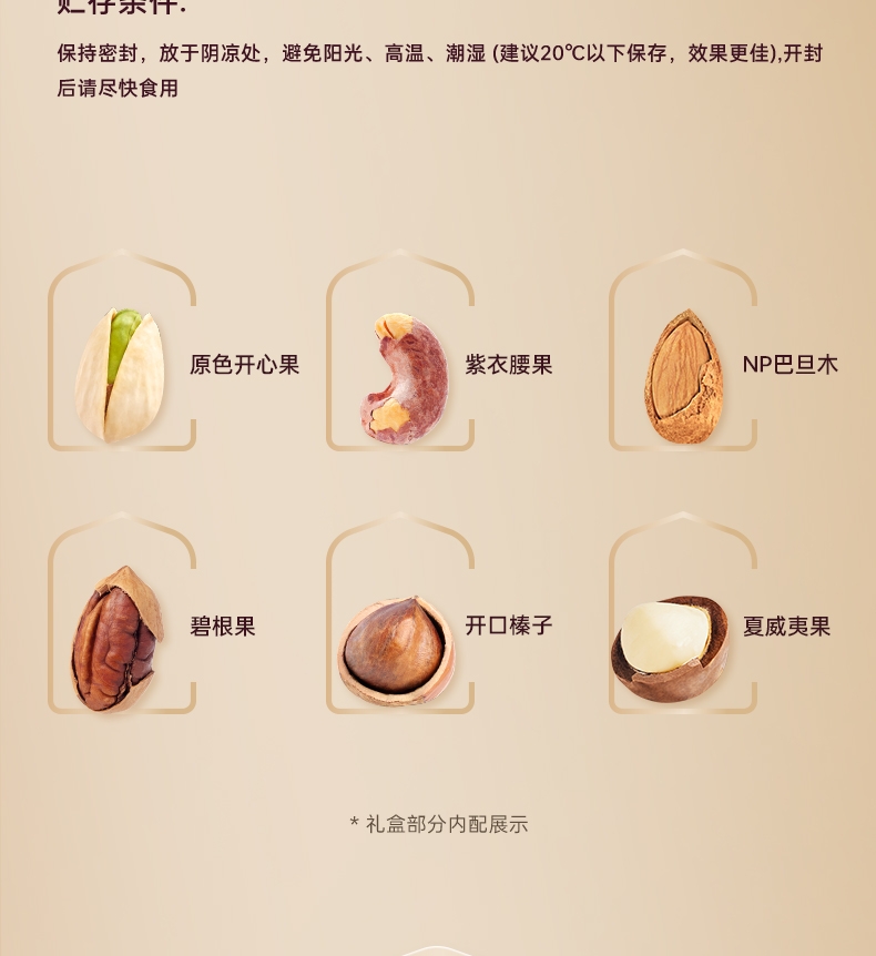 配置清单:1、230g原色开心果*1 2、220g紫衣腰果*1 3、210gNP巴旦木*1 4、240g碧根果*1 5、220g开口榛子*1 6、270g夏威夷果*1 纯坚果组合,高端坚果全国销量领先!