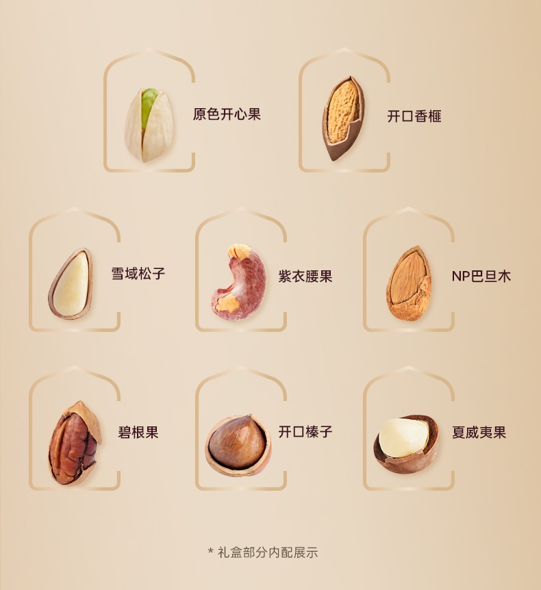 配置清单:1、100g雪域松子*1 2、100g原色开心果*1 3、100g开口香榧*1 4、100g紫衣腰果*1 5、100g碧根果*2 6、100g开口榛子*3 7、100g夏威夷果*3 8、100gNP巴旦木*3 纯坚果组合,高端坚果全国销量领先!