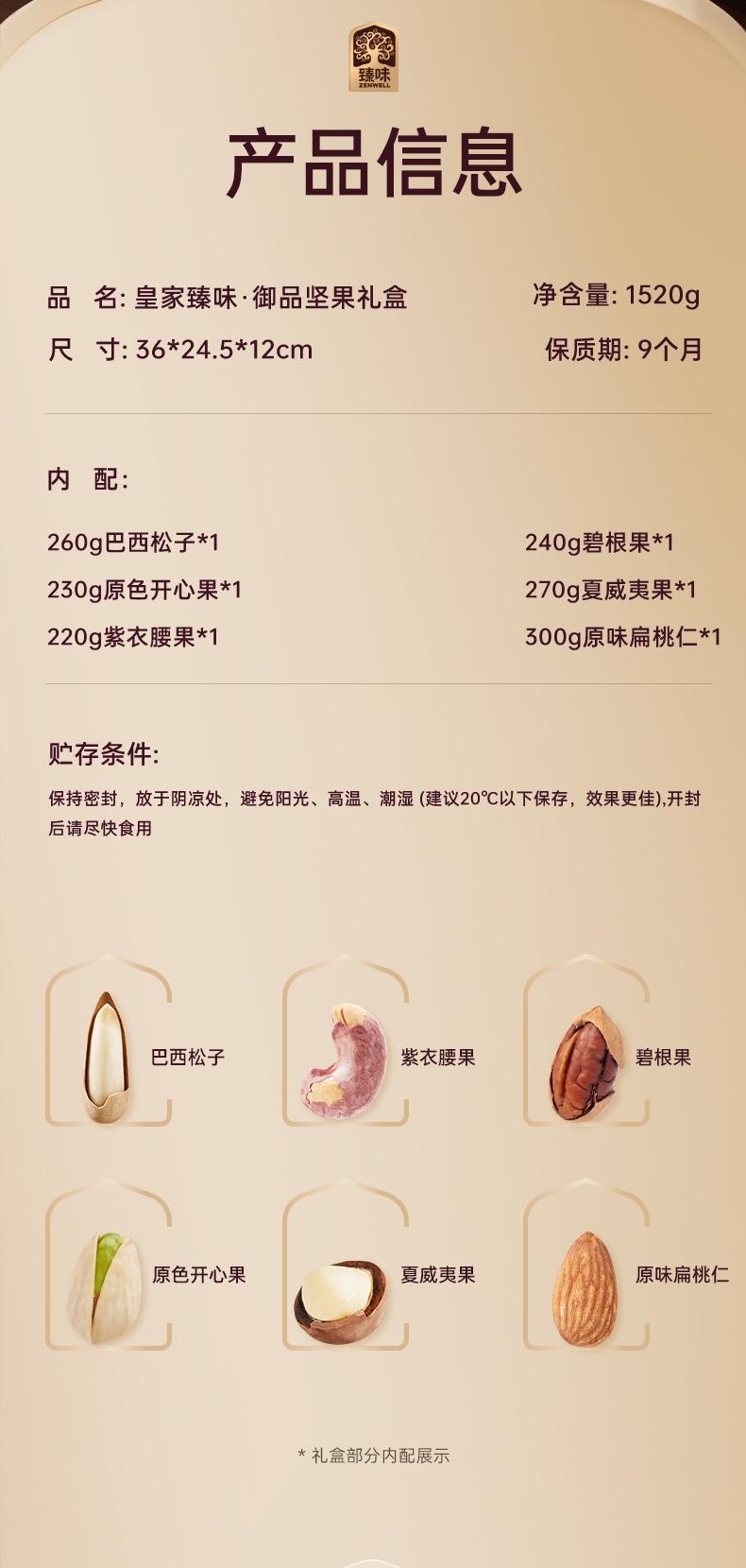 配置清单:260g巴西松子*1 230g原色开心果*1 220g紫衣腰果*1 240g碧根果*1 270g夏威夷果*1 300g原味扁桃仁*1 纯坚果组合,高端坚果全国销量领先!