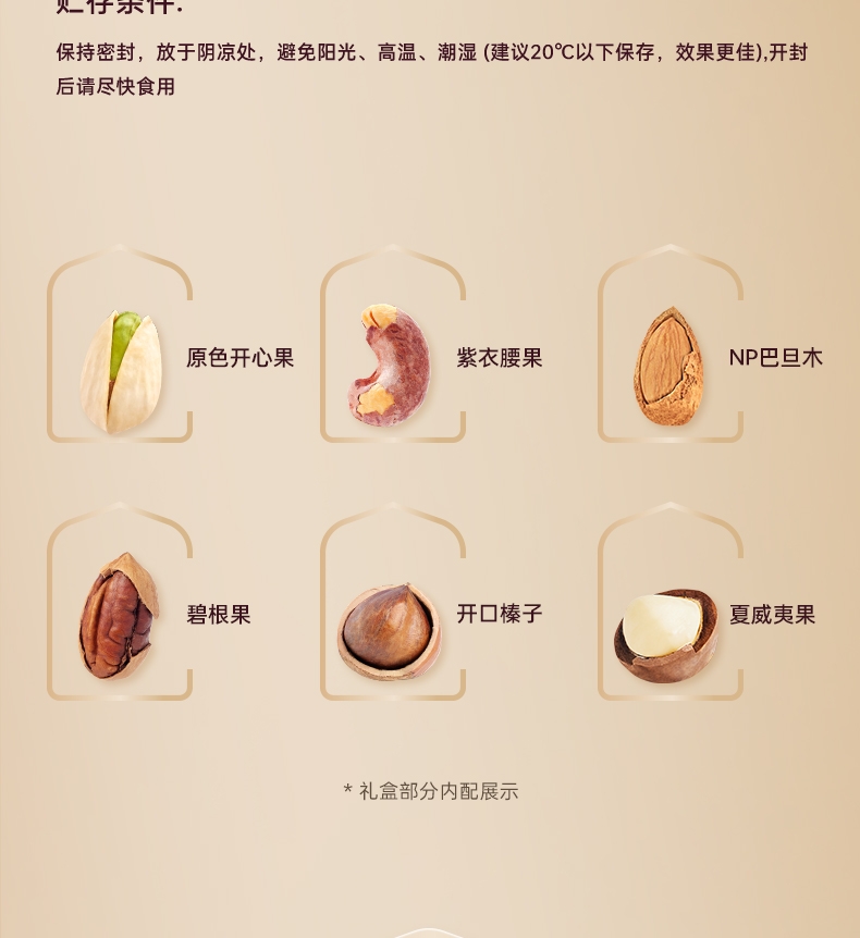 配置清单:1、100g原色开心果*1 2、100g紫衣腰果*2 3、100gNP巴旦木*2 4、100g碧根果*2 5、100g开口榛子*2 6、200g夏威夷果*2 纯坚果组合,高端坚果全国销量领先!