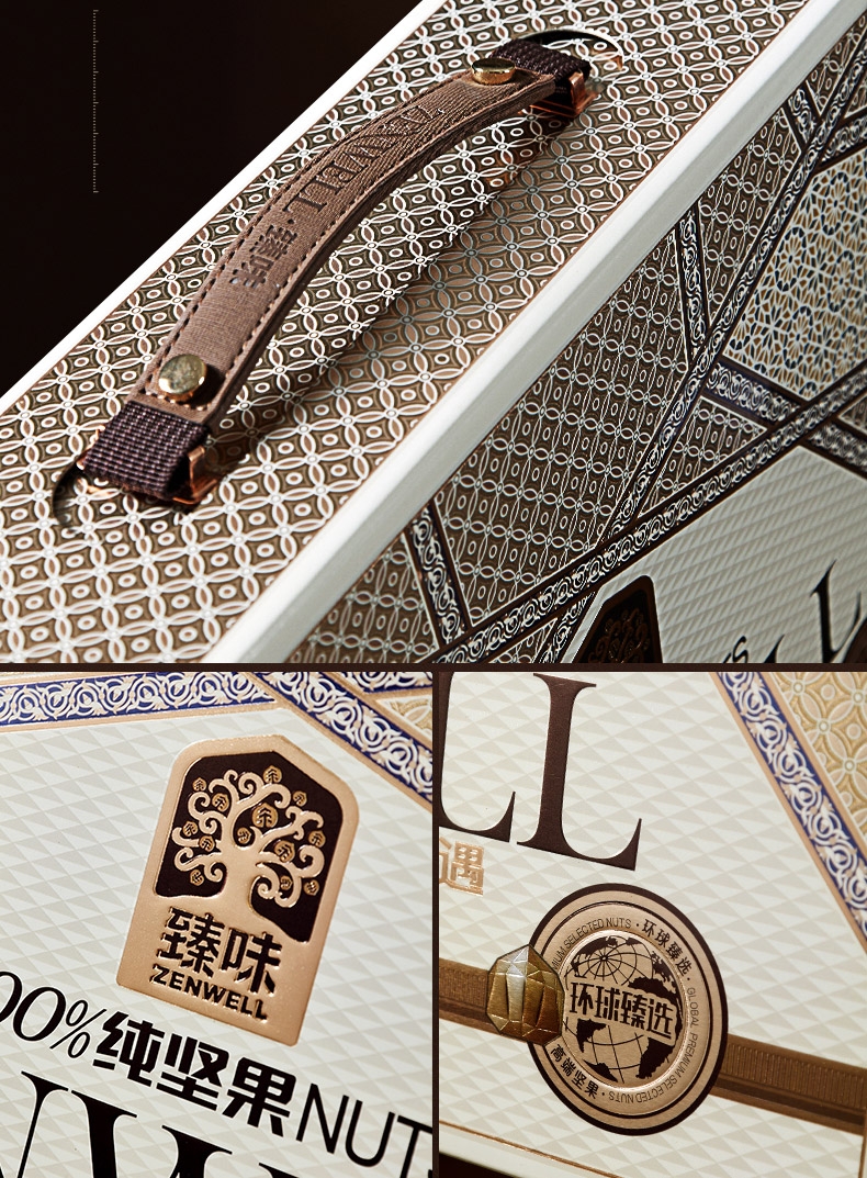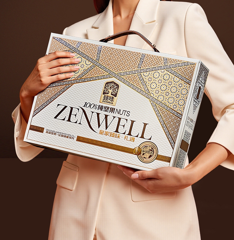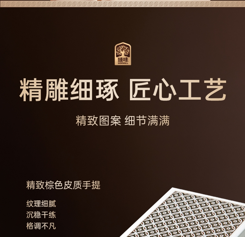 礼盒以金咖色调为主;精致的几何线条与格纹元素搭配棕色皮质手提;整体呈现出优雅的轻奢质感