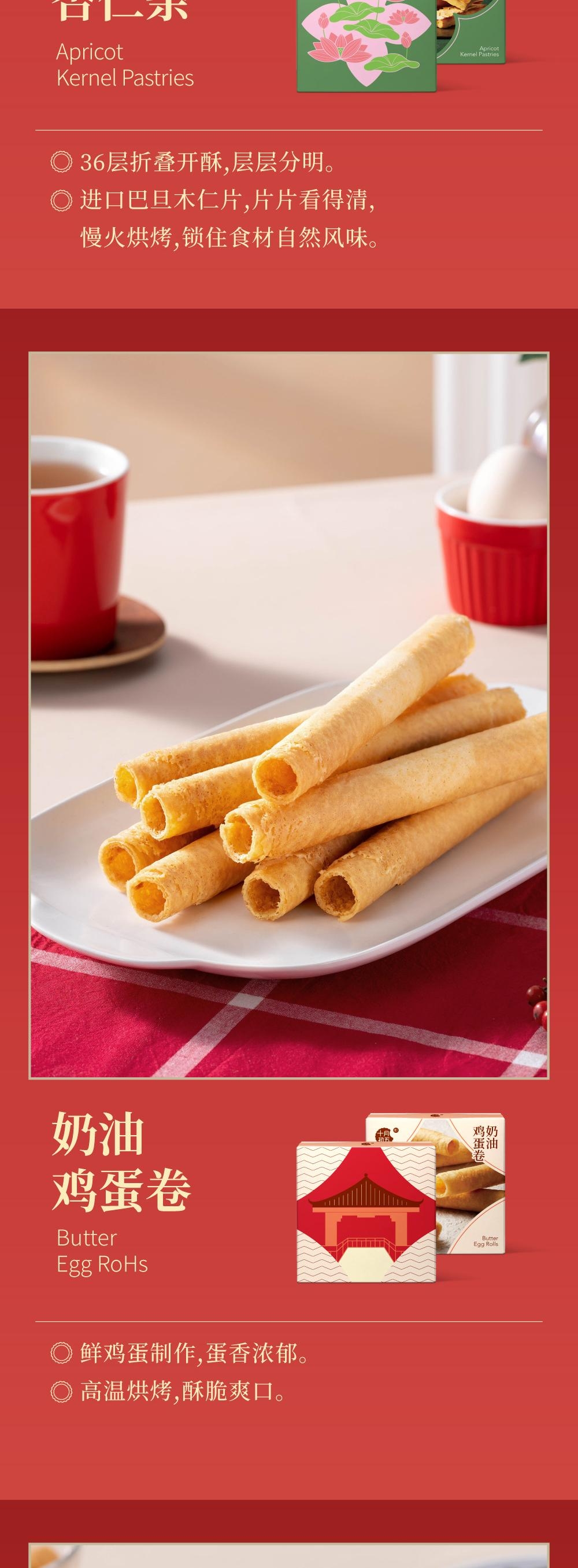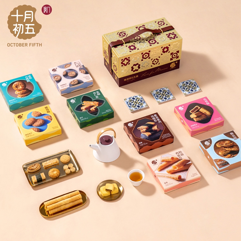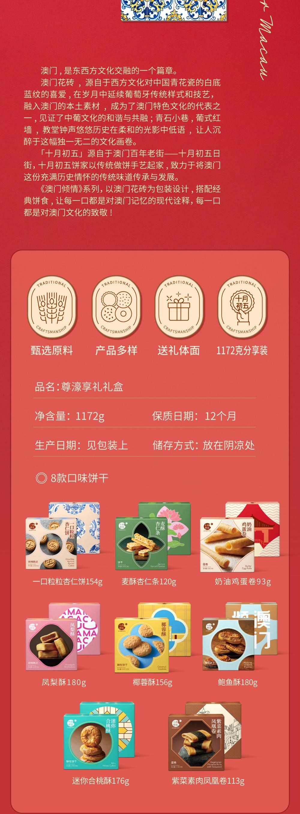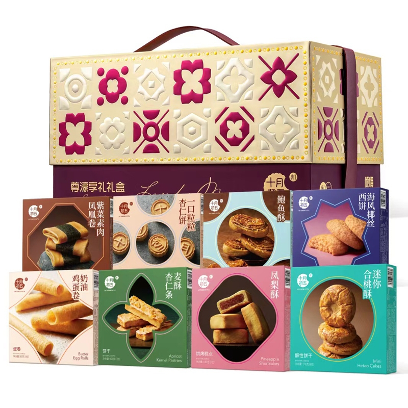 配置清单:1、十月初五93g奶油鸡蛋卷(澳门倾情系列)X1盒 2、十月初五180g凤梨酥(澳门倾情系列)X1盒 3、十月初五180g鲍鱼酥(澳门倾情系列)X1盒 4、十月初五113g紫菜素肉凤凰卷(澳门倾情系列)X1盒 5、十月初五120g麦酥杏仁条(澳门倾情系列)X1盒 6、十月初五154g一口粒粒杏仁饼(澳门倾情系列)X1盒 7、十月初五156g椰蓉酥(澳门倾情系列)X1盒 8、十月初五176g迷你合桃酥(澳门倾情系列)X1盒 注:高端礼盒