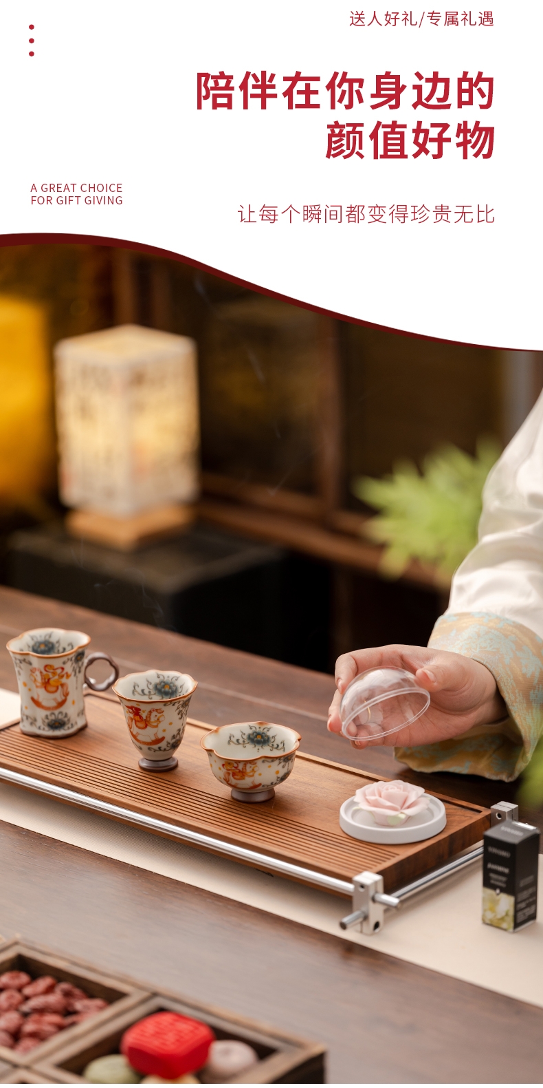 规格:手柄杯 6*9cm 闻香杯6.5*6.3cm 碗7.6*4.4cm 香盘12*3.6cm 玫瑰扩香器7.9*4.3cm