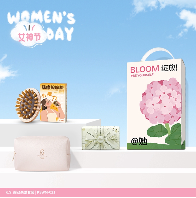 经典温柔粉蓝配色,花体英文点缀,传递女性力量;性价比高,更适合员工福利、活动营销等;礼盒、内容物件上均可实现中小批量成品订制