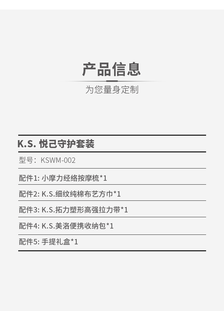 配置清单:1.小摩力经络按摩梳*1 2.K.S.细纹纯棉布艺方巾*1 3.K.S.拓力塑形高强拉力带*1 4.K.S.美洛便携收纳包*1 5.手提礼盒*1