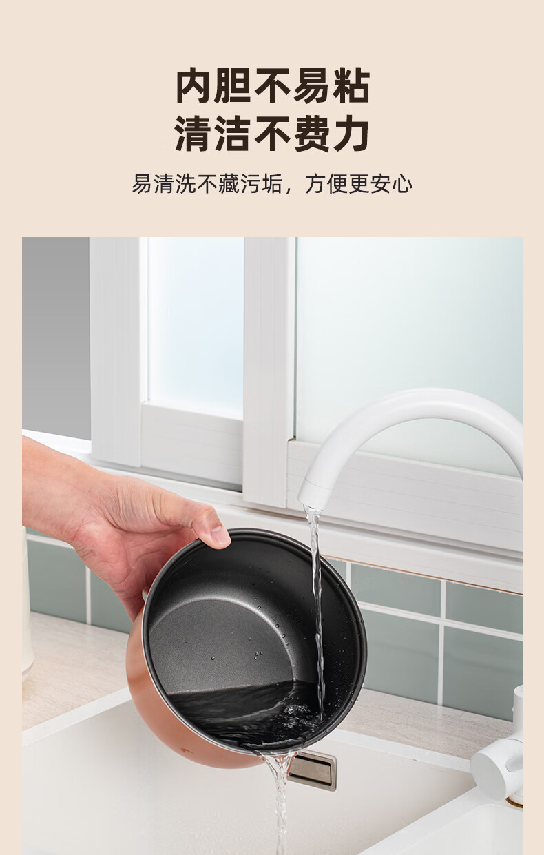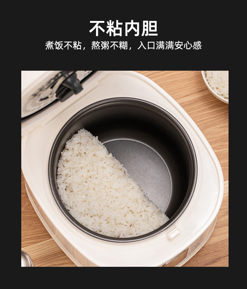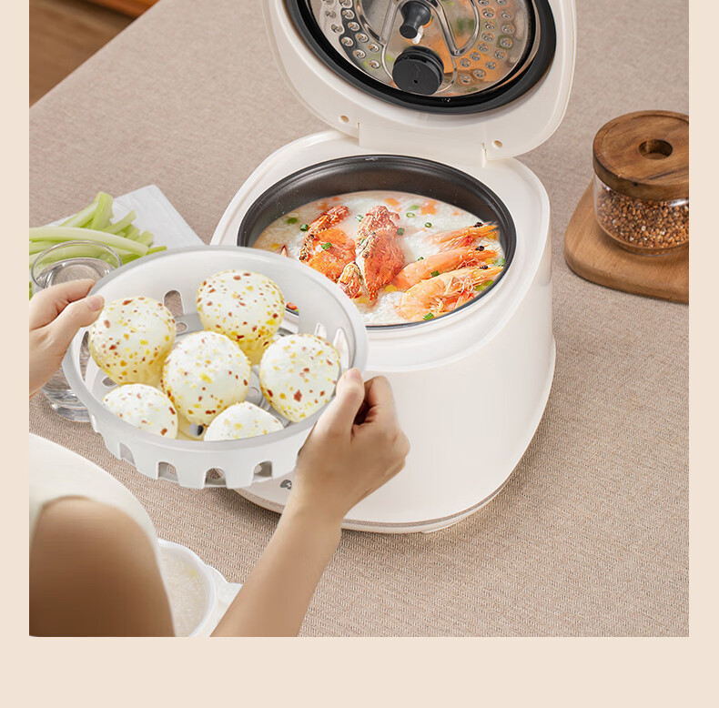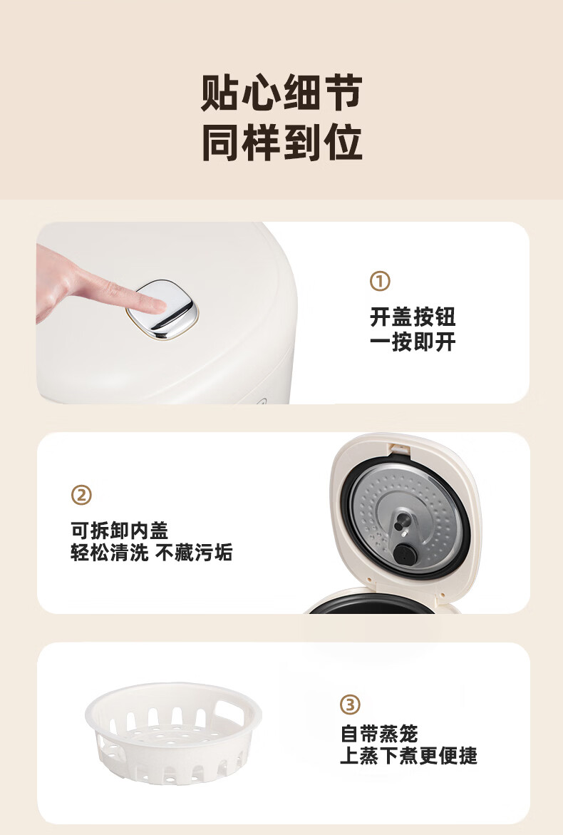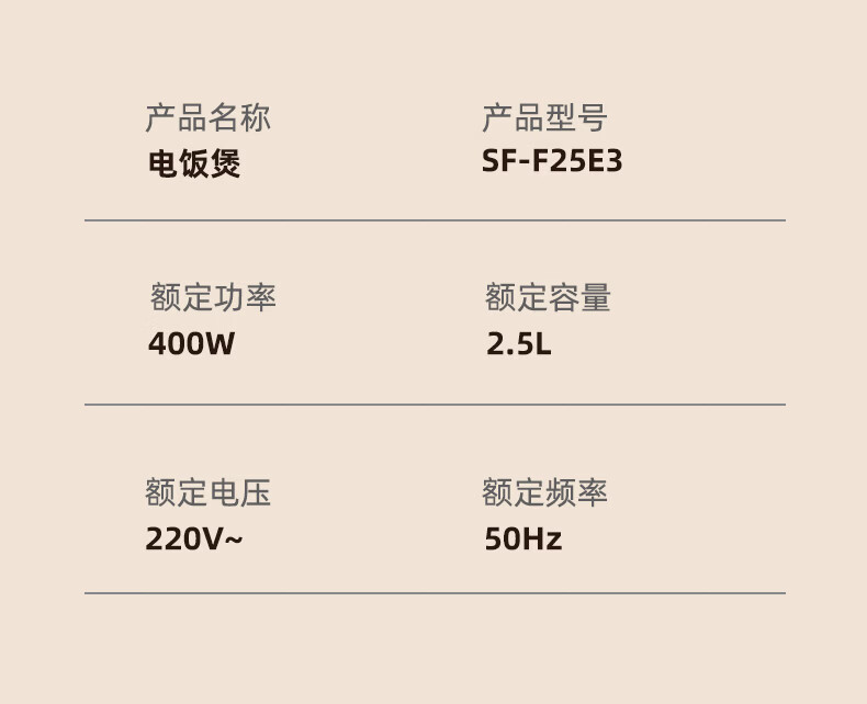 配置清单:涂层材质 特氟龙涂层 容量 2.5L 能效等级 无能效等级 内胆材质 铁铝合金 主色系 白色系 认证型号 SF-F25E3 蒸屉材质 PP(聚丙烯) 电源线长 1m 额定功率 400W 内胆形状 直柱型 适用人数 2-3人 是否0涂层内胆 否 压力值 微压(20-40 kpa) 加热方式 底盘
