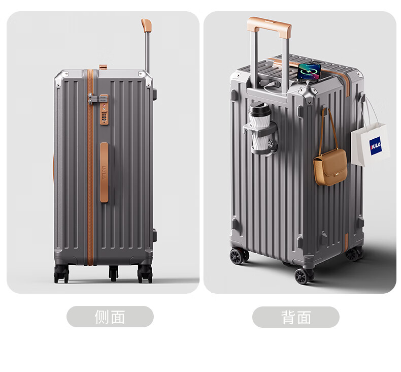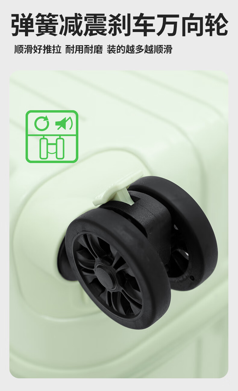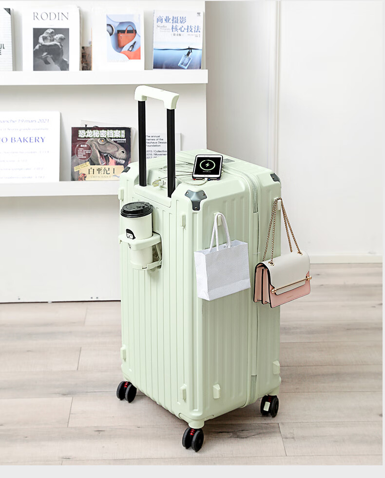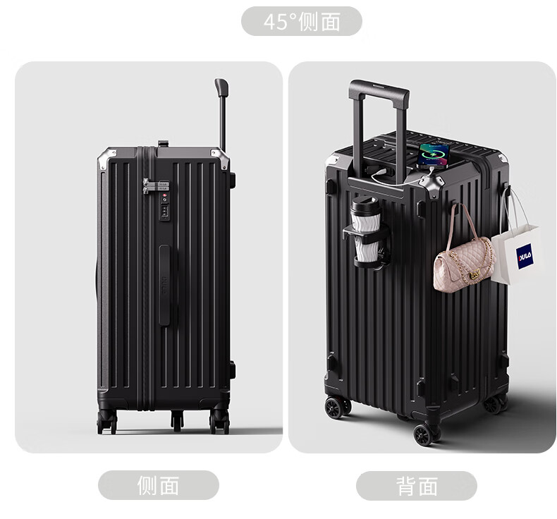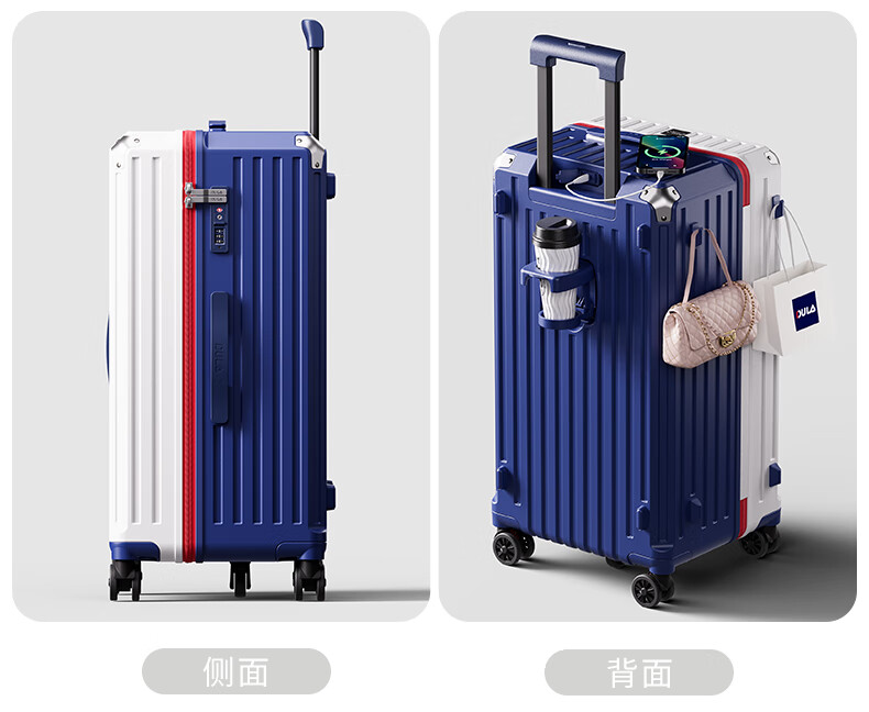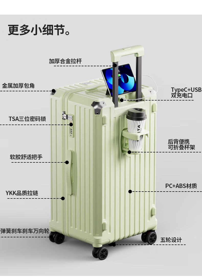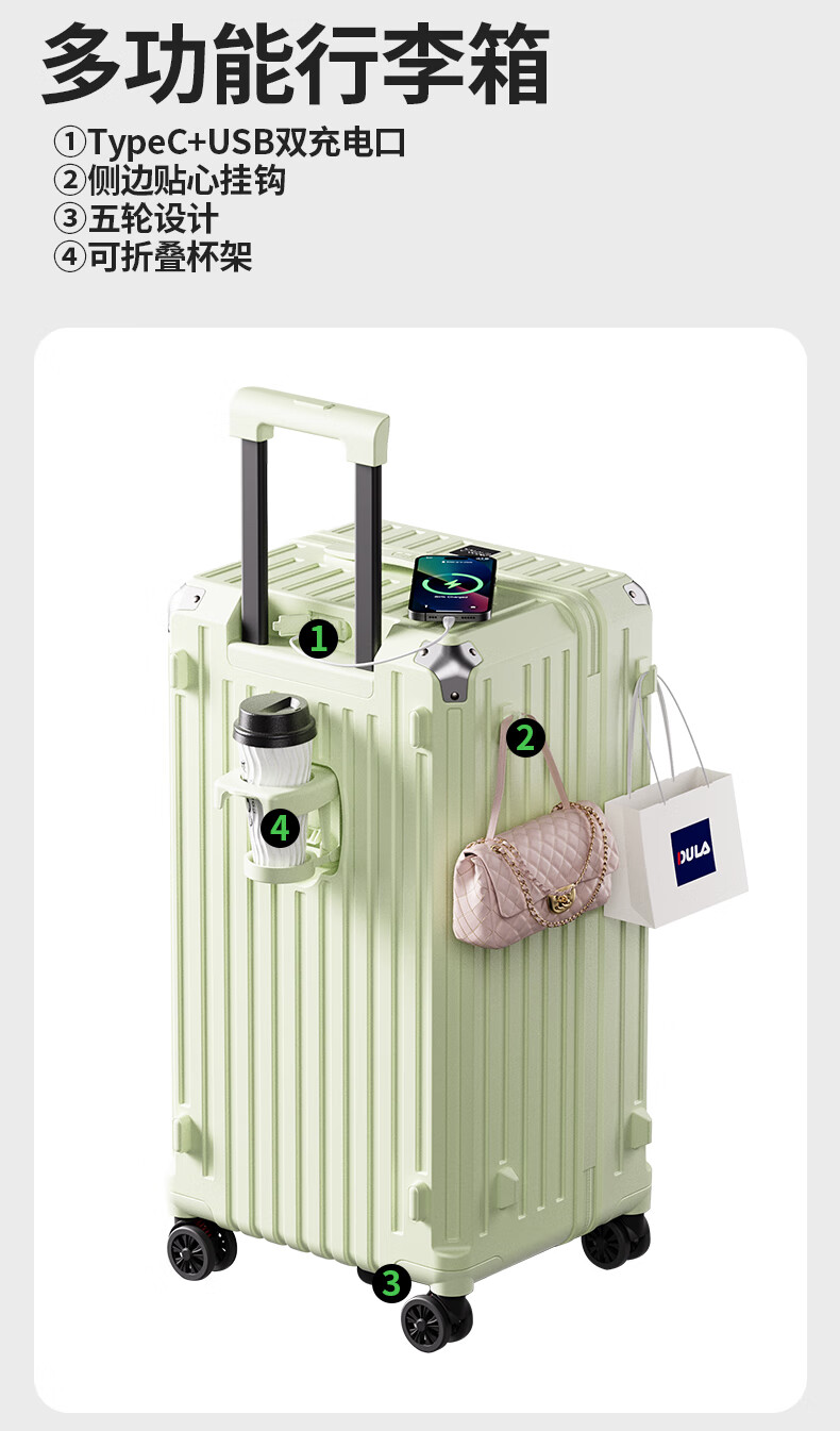 后背便携式折叠杯架,TypeC+USB双充电口;升级超大容量更能装,加厚金属拉杆伸缩不卡顿;弹簧减震刹车万向轮