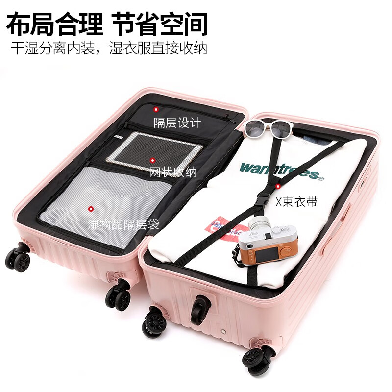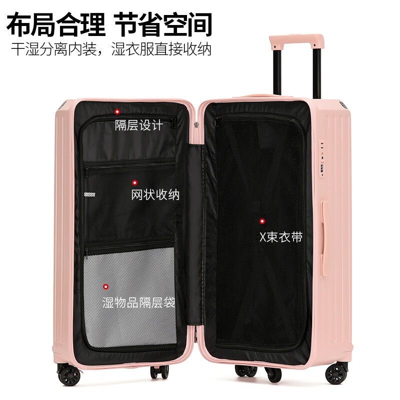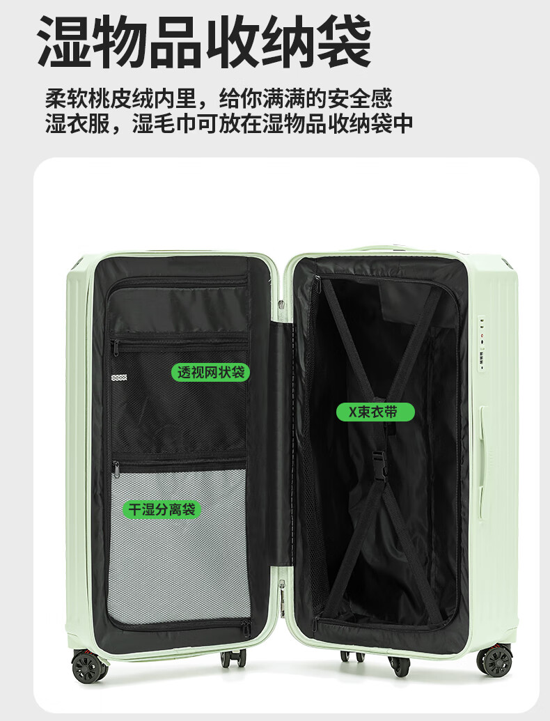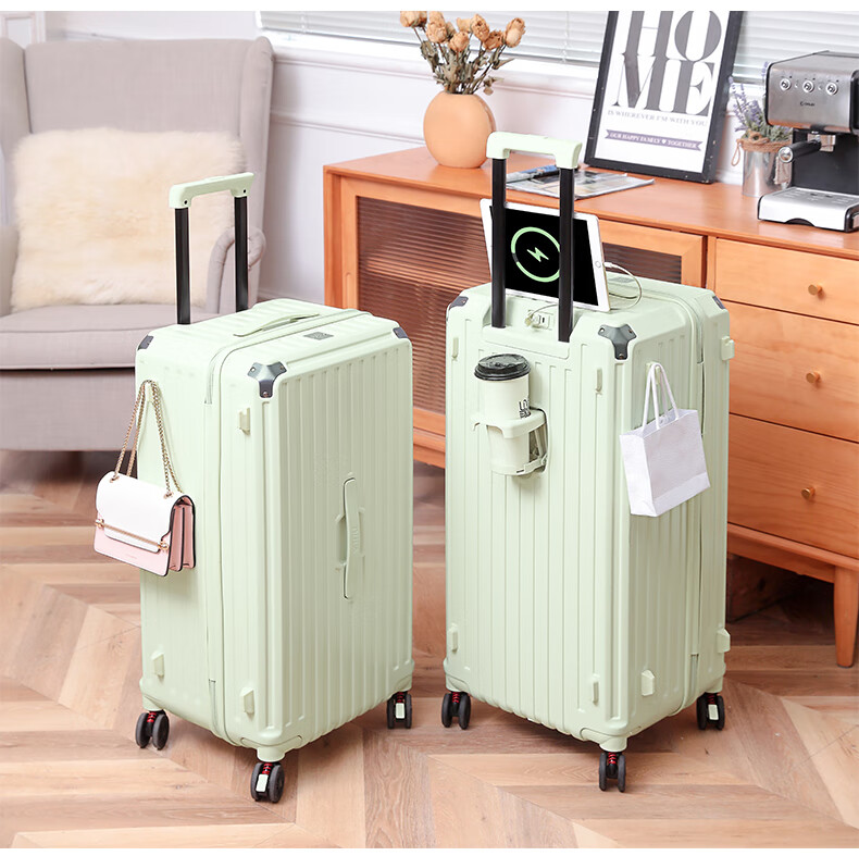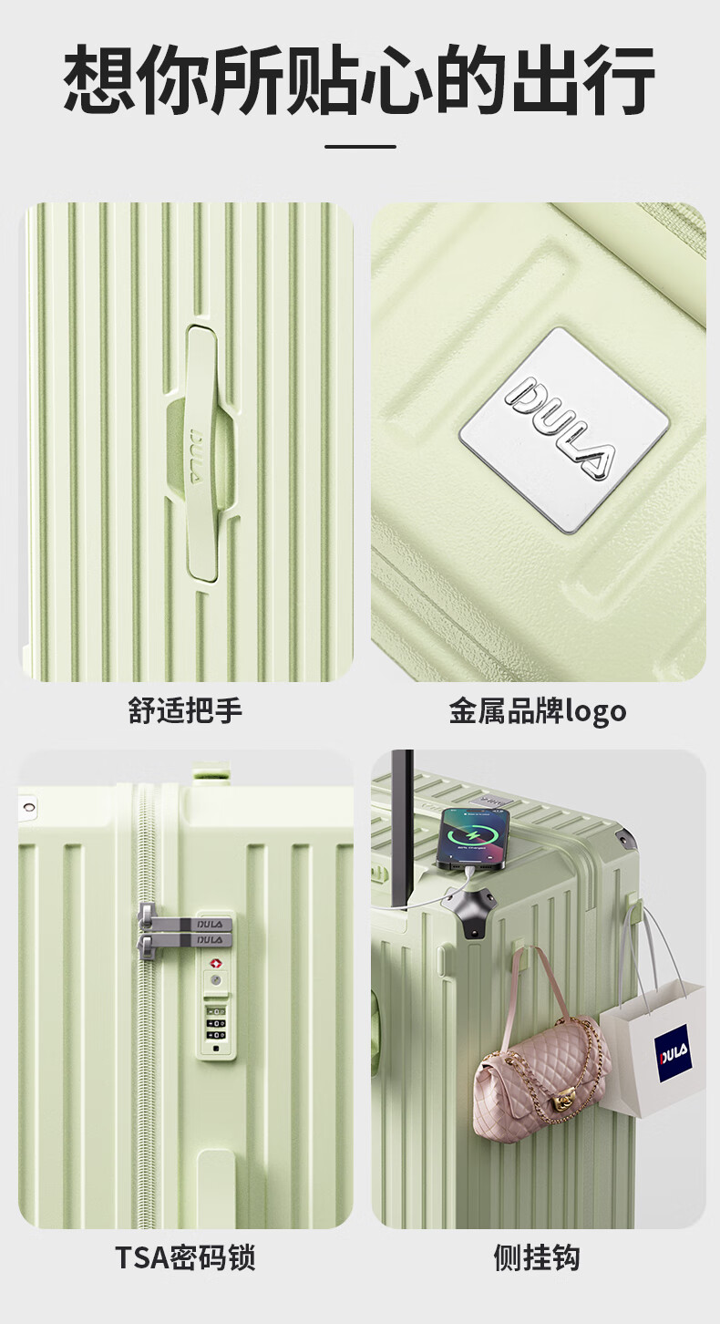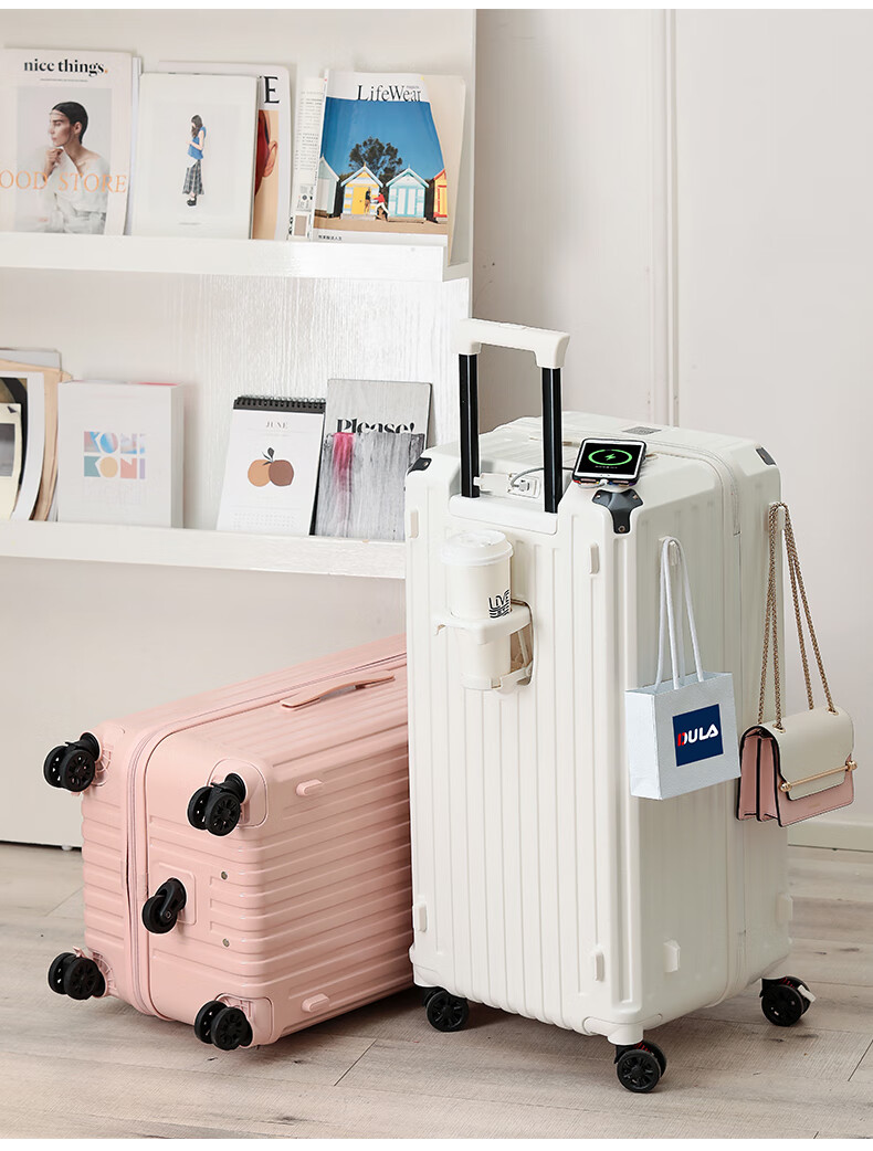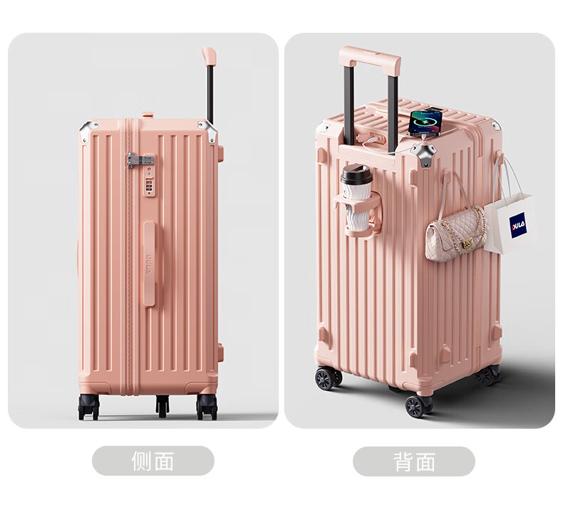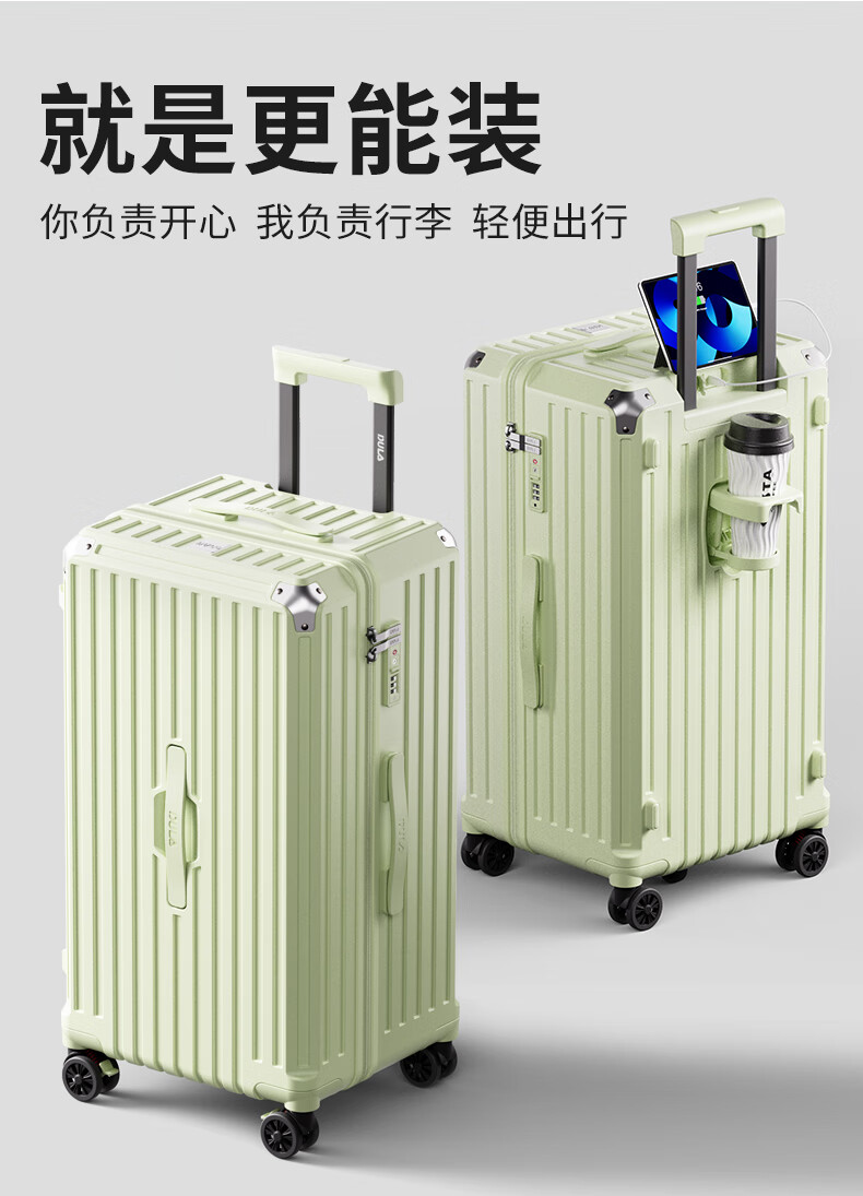 后背便携式折叠杯架,TypeC+USB双充电口;升级超大容量更能装,加厚金属拉杆伸缩不卡顿;弹簧减震刹车万向轮