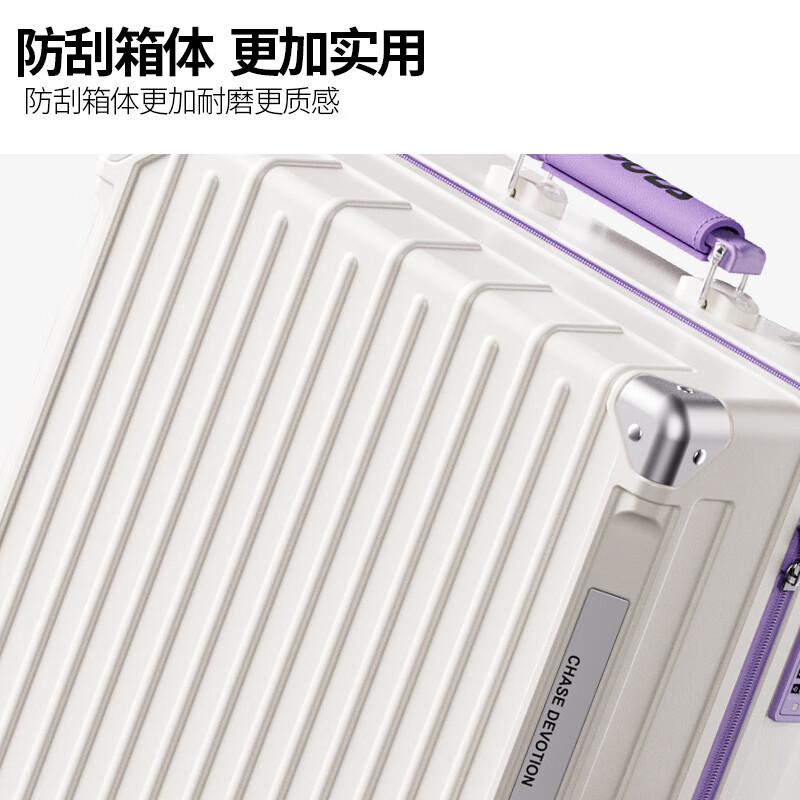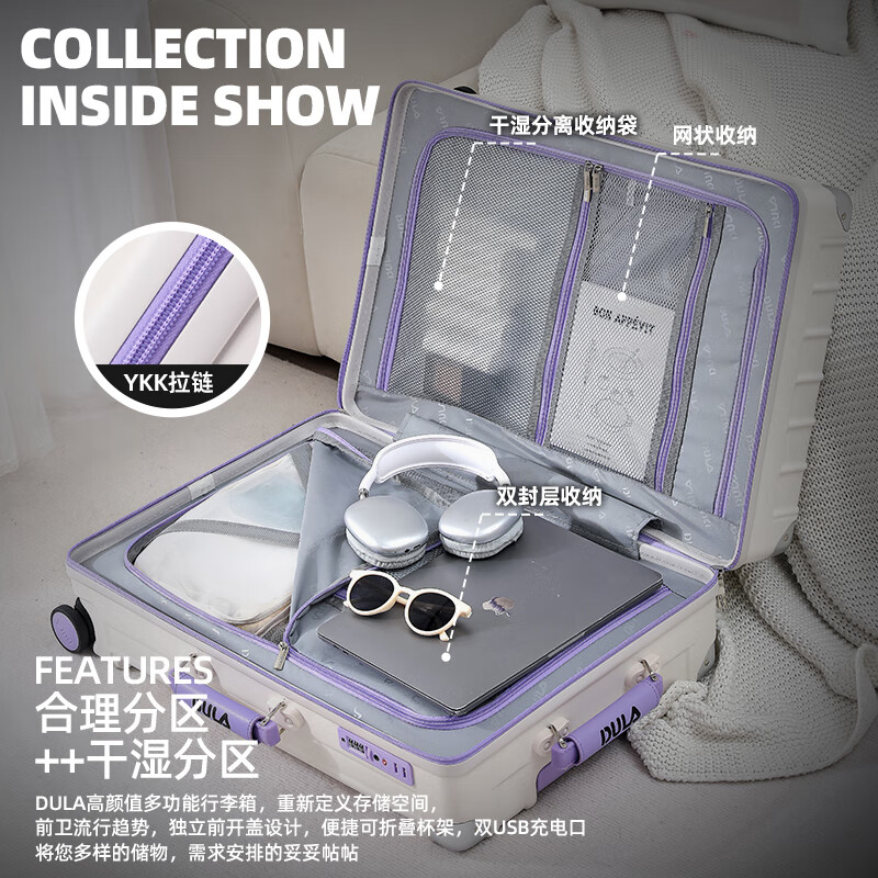 隐藏式手机支架,TypeC+USB双充电口;采用高含PC三层复合板材,韧性强抗压好;TPE+PP轻音万向轮+加厚铝合金拉杆