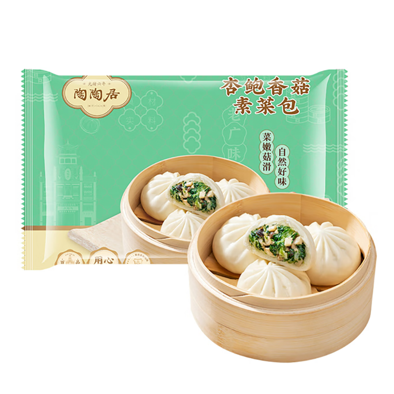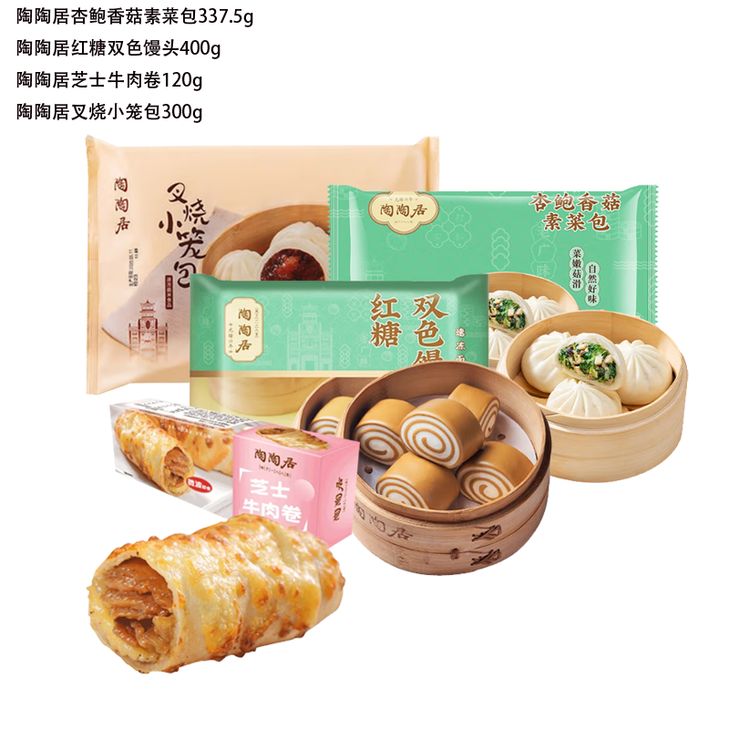 配置:陶陶居杏鲍香菇素菜包337.5g 陶陶居红糖双色馒头400g 陶陶居芝士牛肉卷120g 陶陶居叉烧小笼包300g