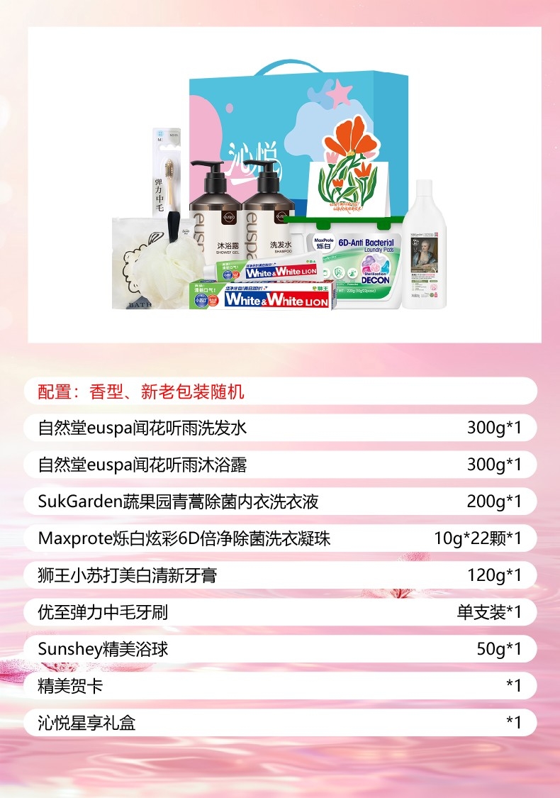 配置清单:自然堂euspa闻花听雨洗发水300g*1 自然堂euspa闻花听雨沐浴露300g*1 SukGarden蔬果园青蒿除菌内衣洗衣液-200g*1 Maxprote烁白炫彩6D倍净除菌洗衣凝珠10g*22颗*1 狮王(Lion)小苏打美白清新牙膏120g*1 优至弹力中毛牙刷单支装*1 Sunshey瞬适绵润焕肤沐浴球*1 精美贺卡*1(量大可定制) 沁悦星享礼盒ZS226*1