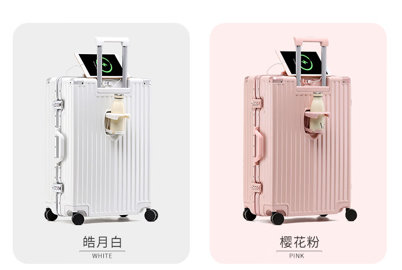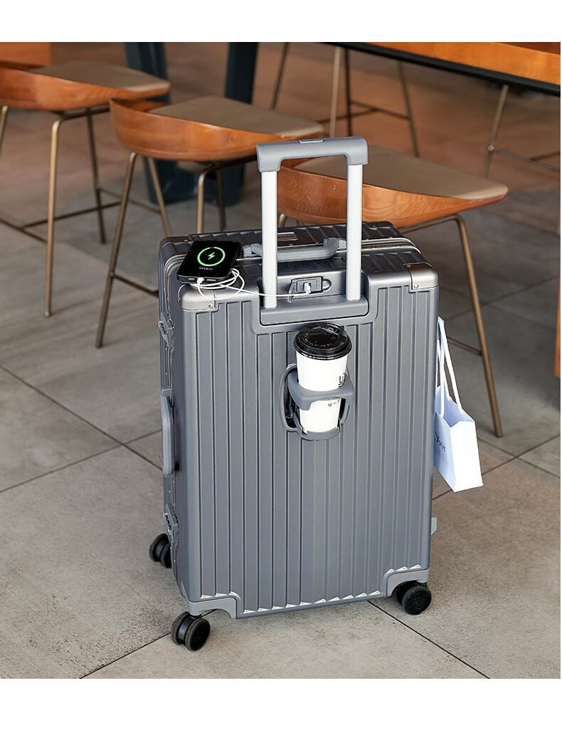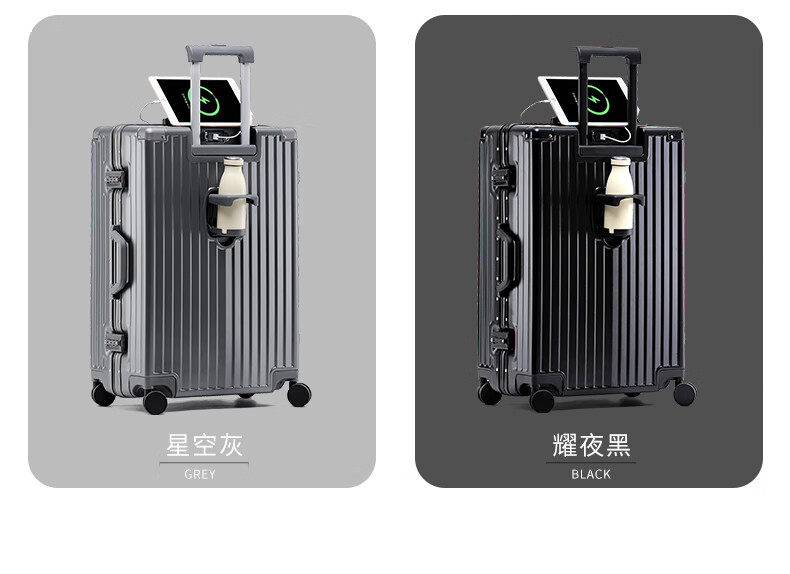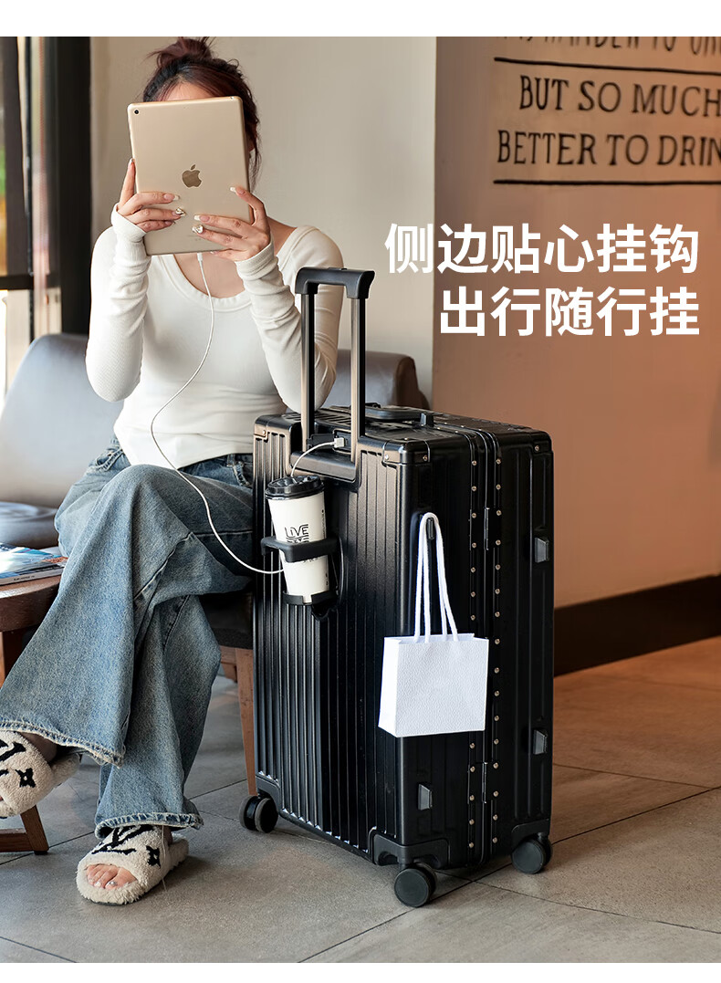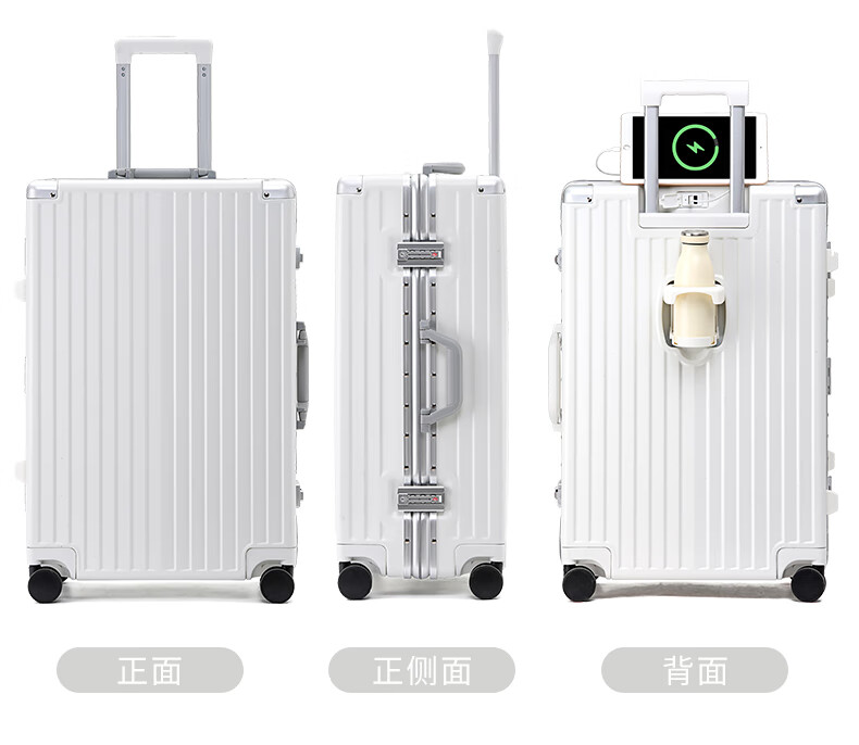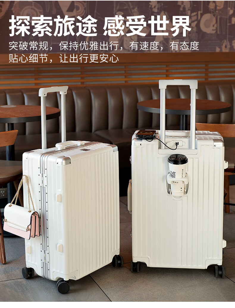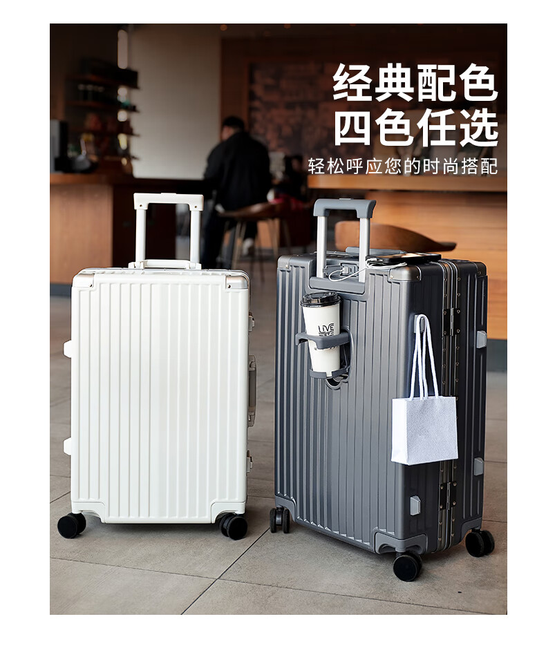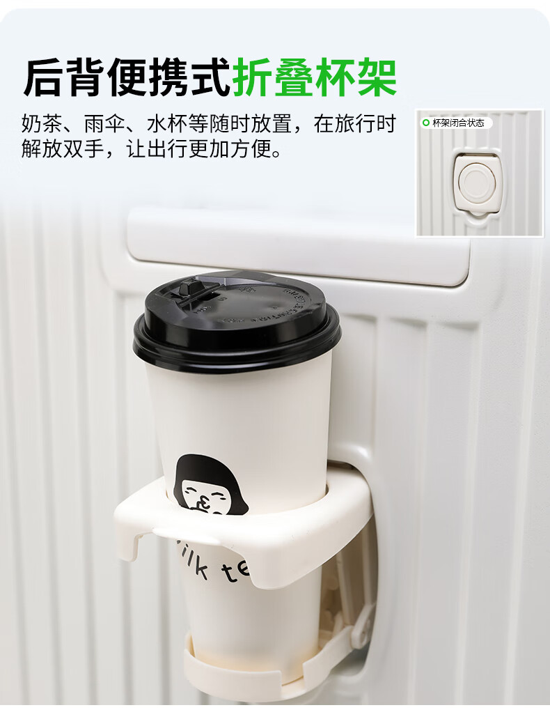 ABS+PC复合箱面耐磨更有质感,防刮;后背折叠杯架;轻音万向轮,顺滑好推拉耐用耐磨装的越多越顺滑