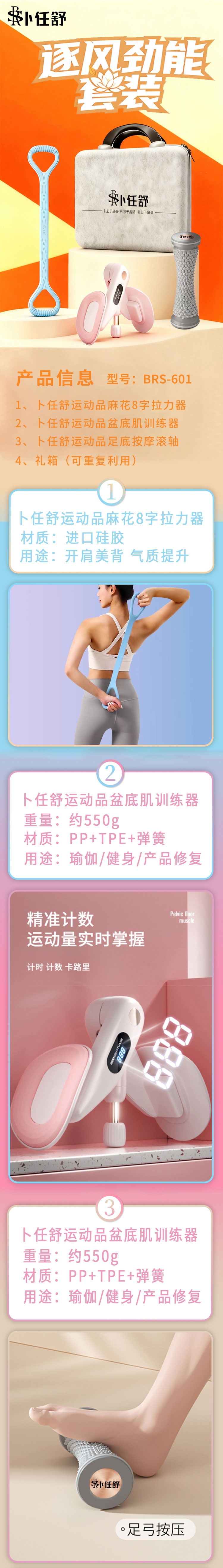 配置清单:卜任舒运动品麻花8字拉力器 卜任舒运动品盆底肌训练器 卜任舒运动品足底按摩滚轴 礼箱(可重复利用)
