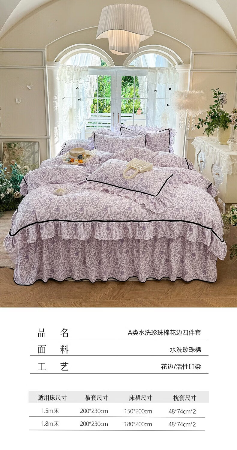 规格:适用于1.5米床 被套200*230*1 床裙150*200*1 枕套48*74*2