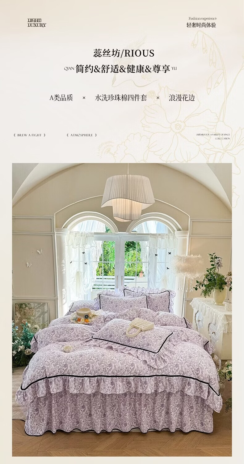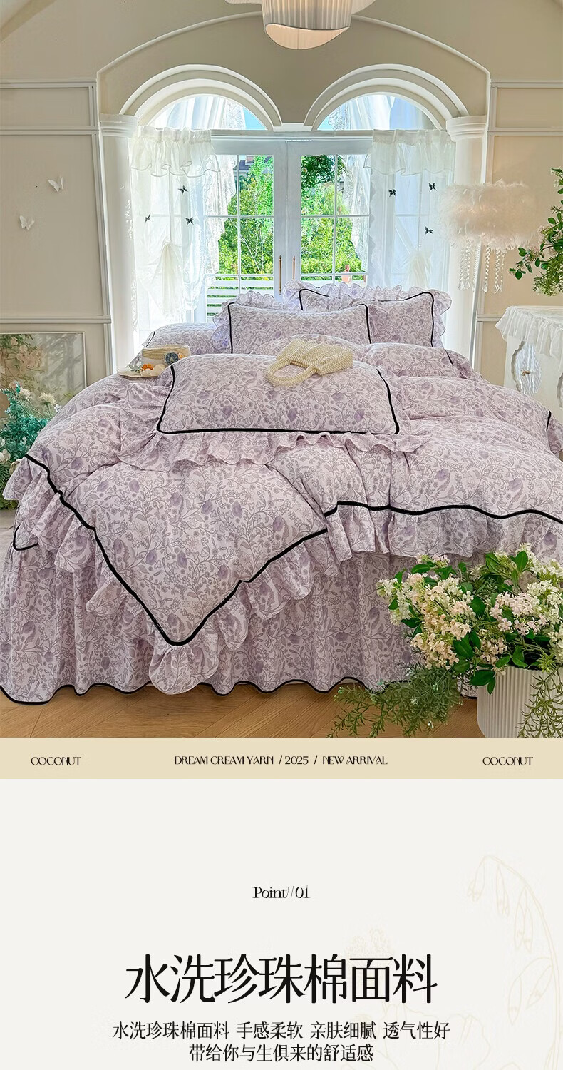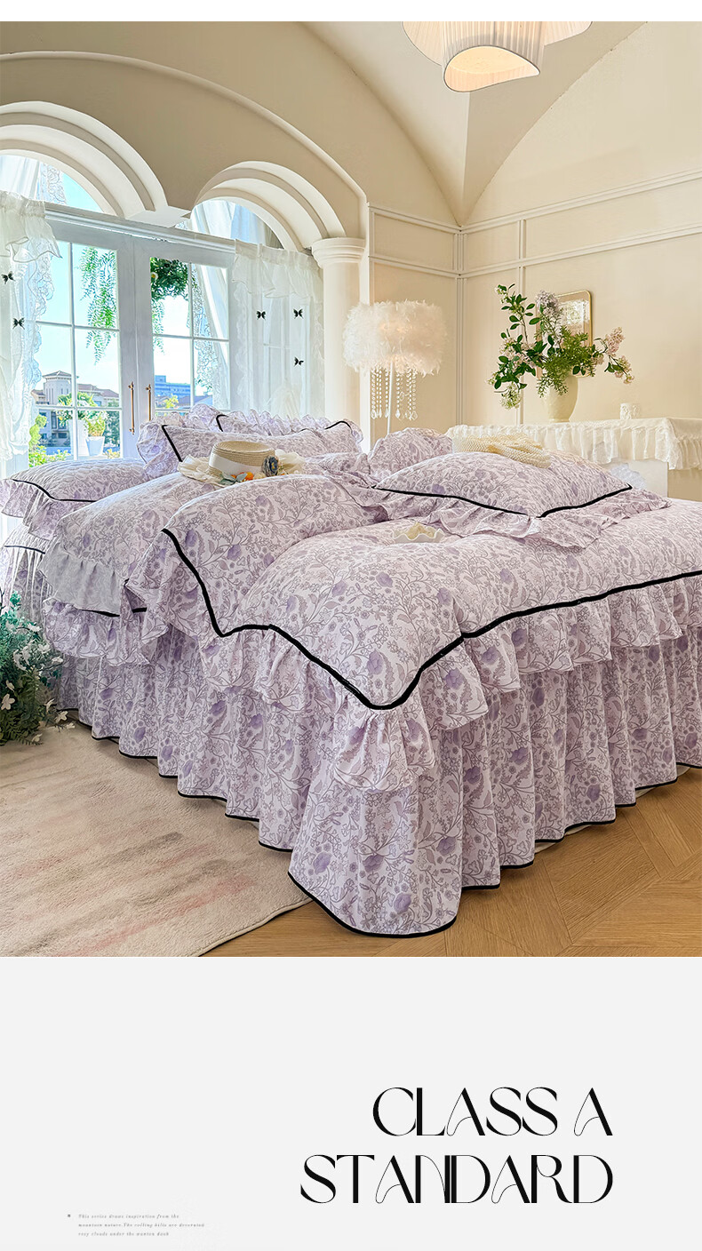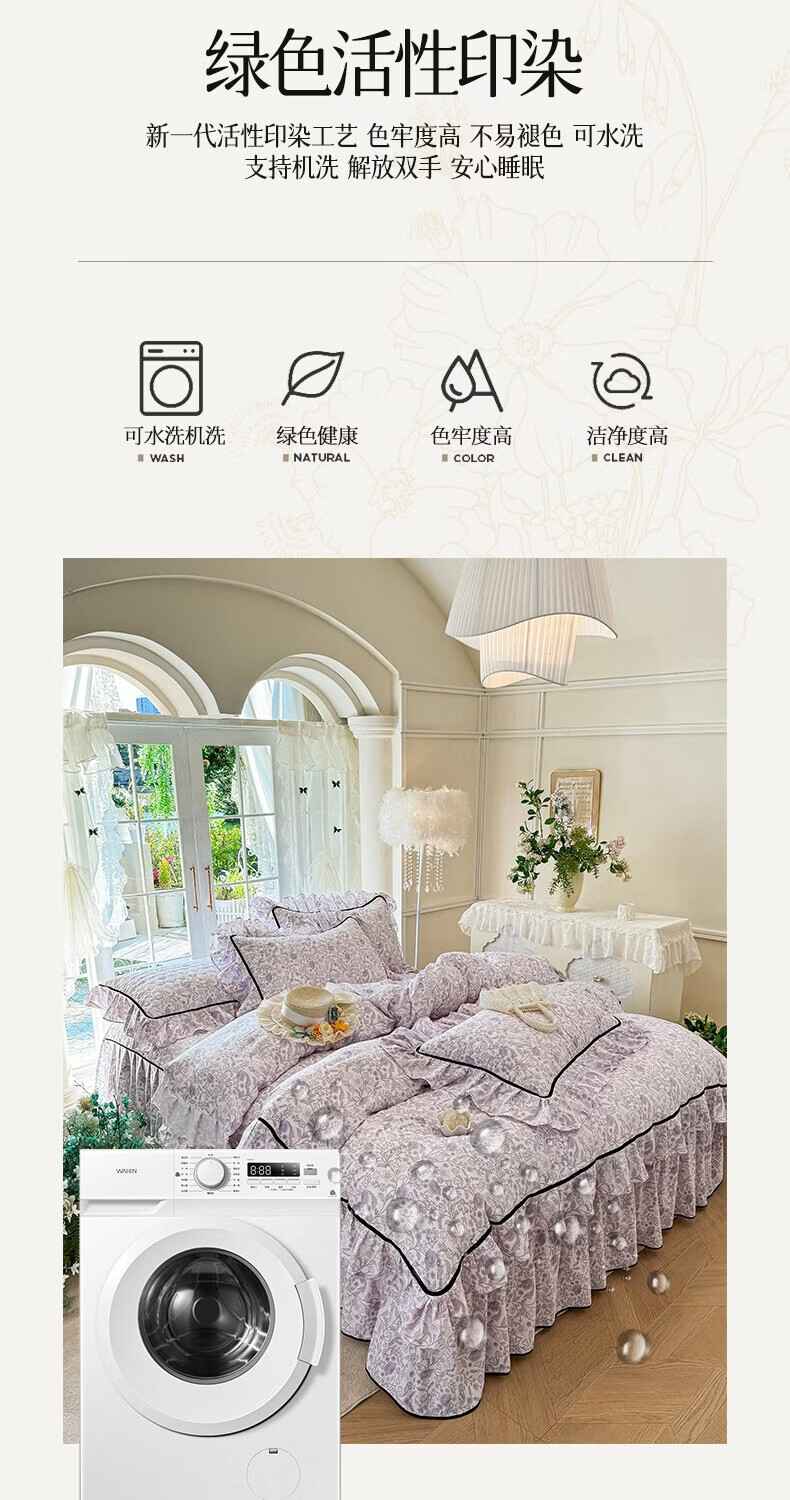 裙摆是自带 蓬松感的大荷叶边,自带法式复古柔美感;裙长适配多数床型,铺好就是 卧室 “软装亮点”;水洗工艺加持,多次机洗后依旧不褪色、不起球