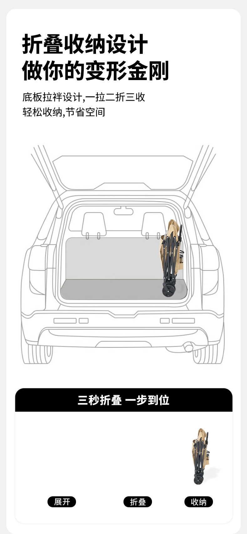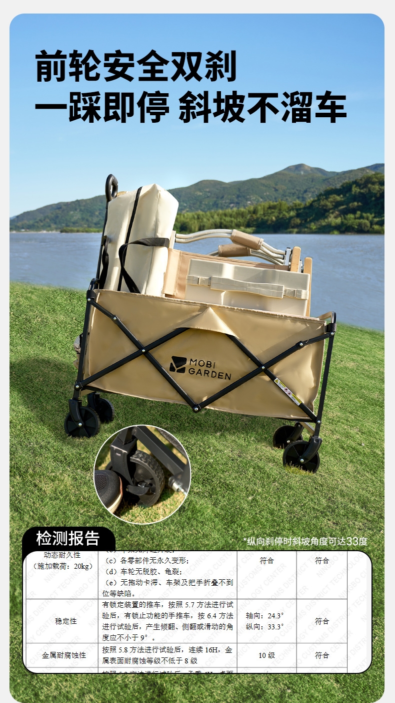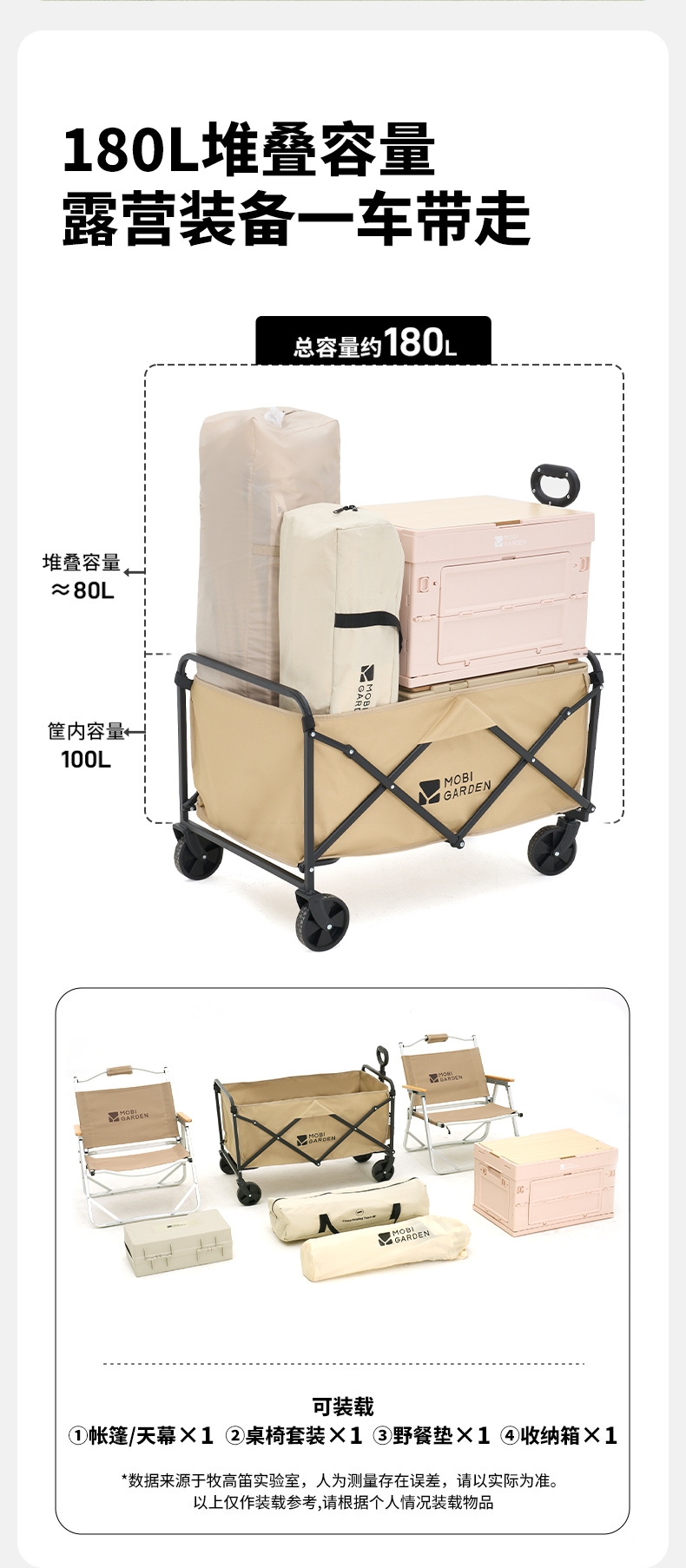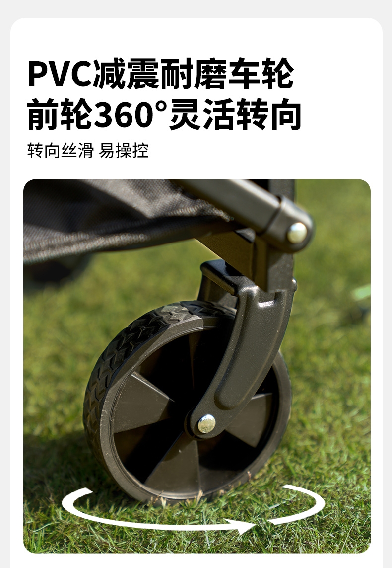 大容量设计,全家装备一车带走;布套可拆洗,360度同轴转向轮(前面2轮);可伸缩手柄、折叠便携设计;带刹车轮设计