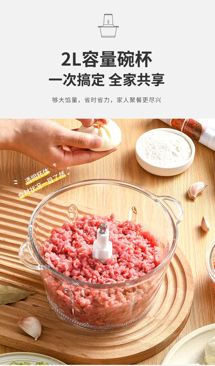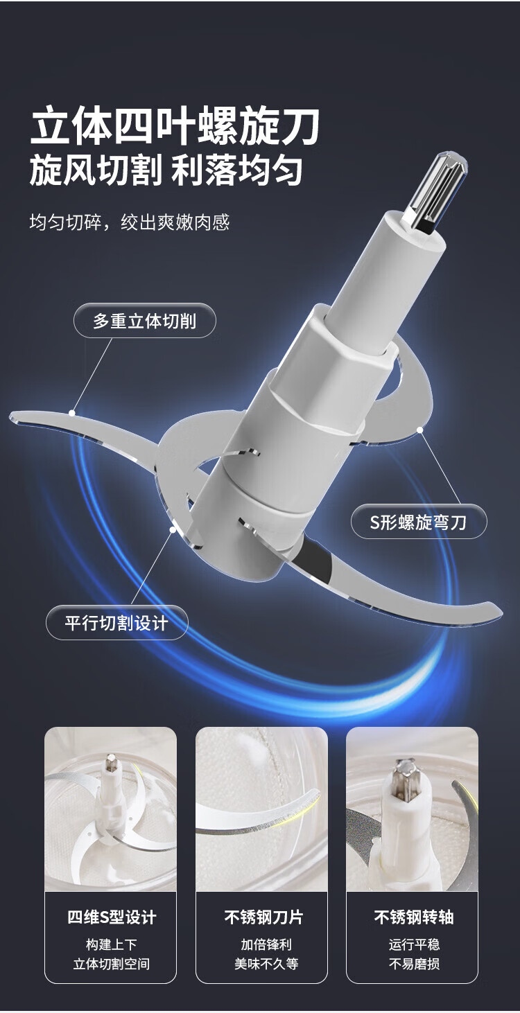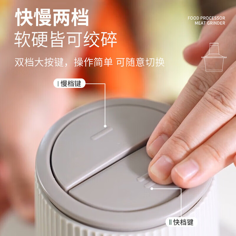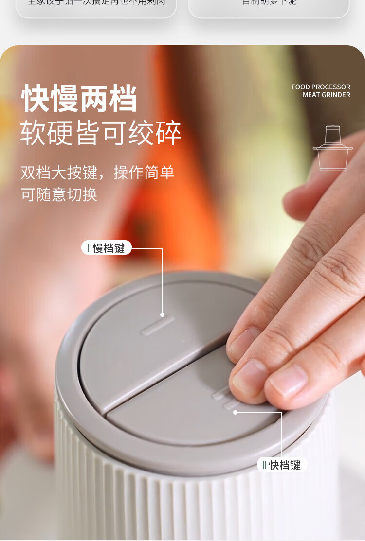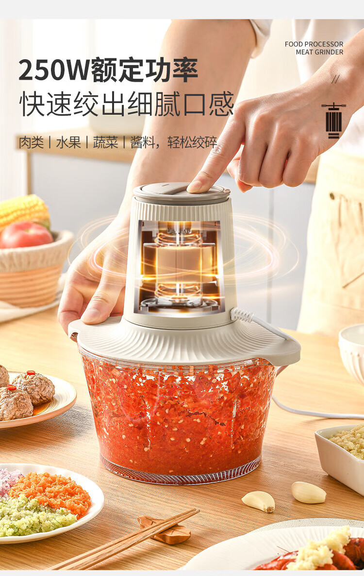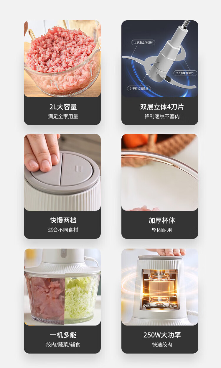 250W,28000转高速运转,约6秒可出肉馅;上层初步切碎、下层精细打磨;支持绞肉、搅拌、制作辅食、蒜泥等多种食材处理