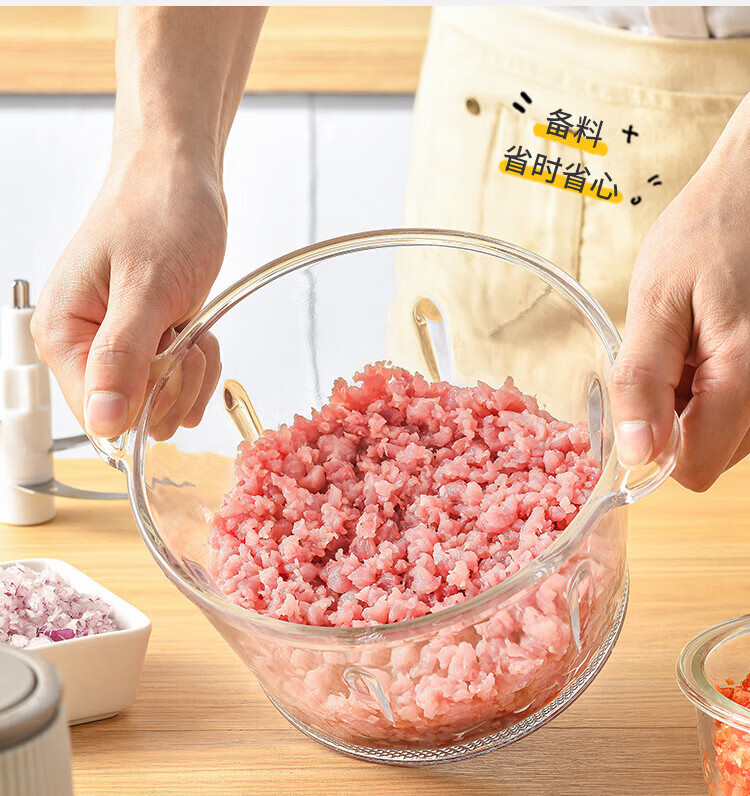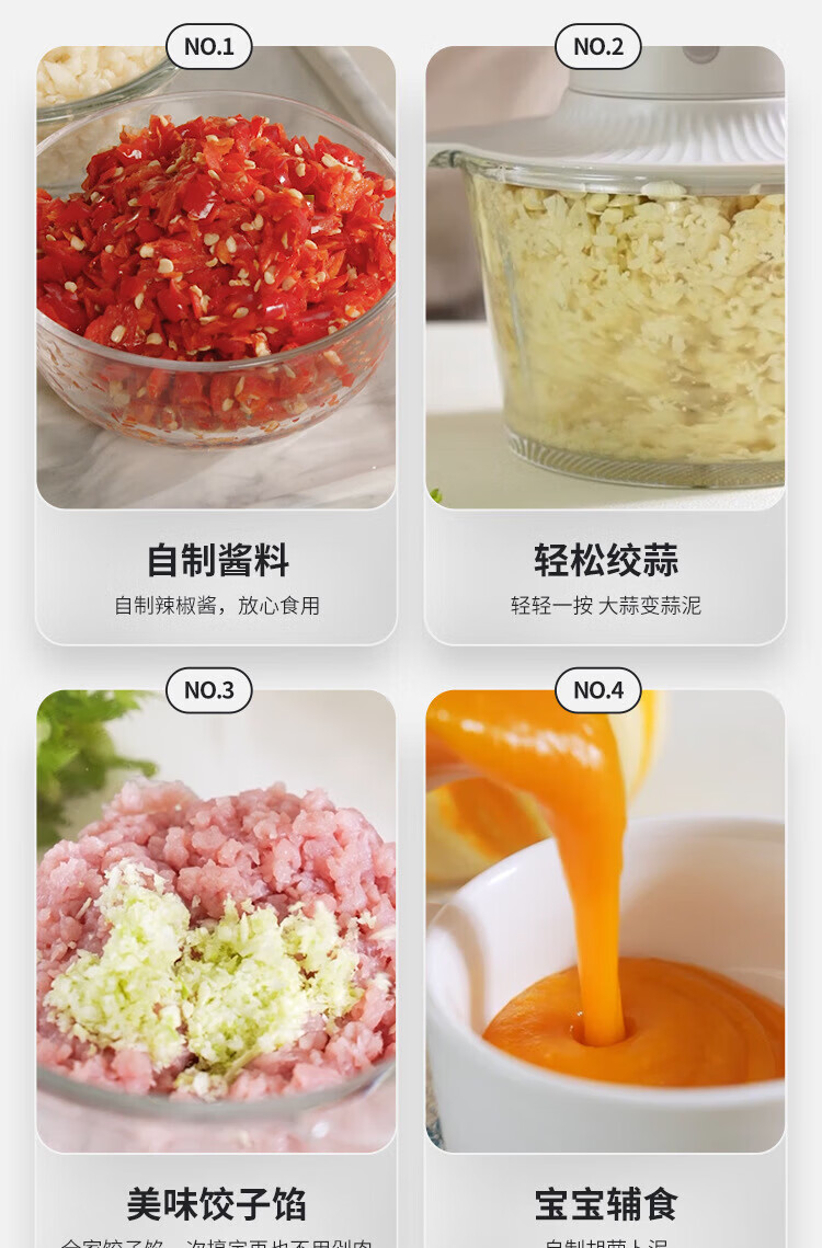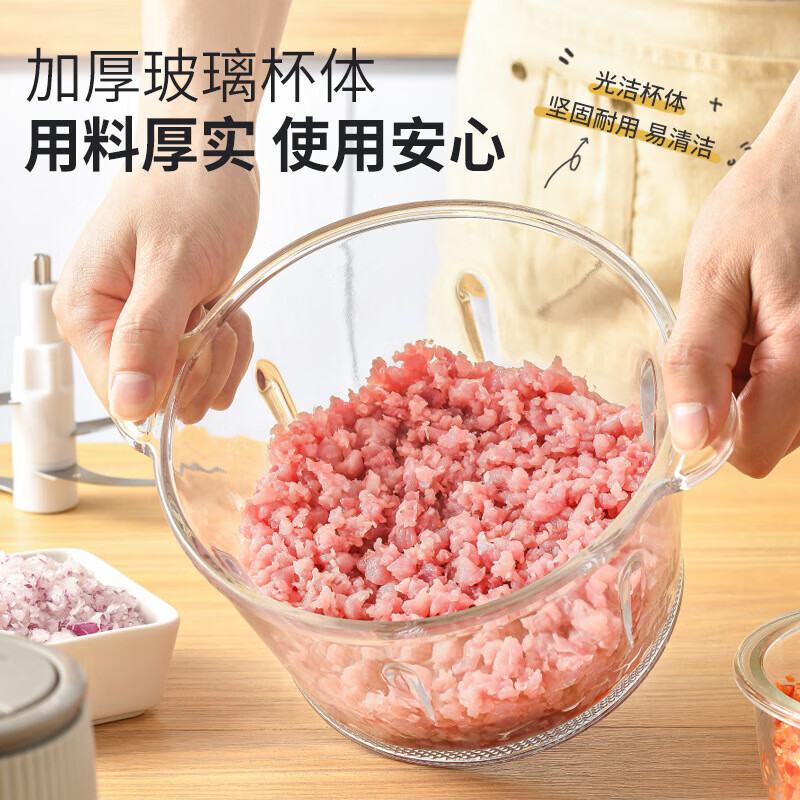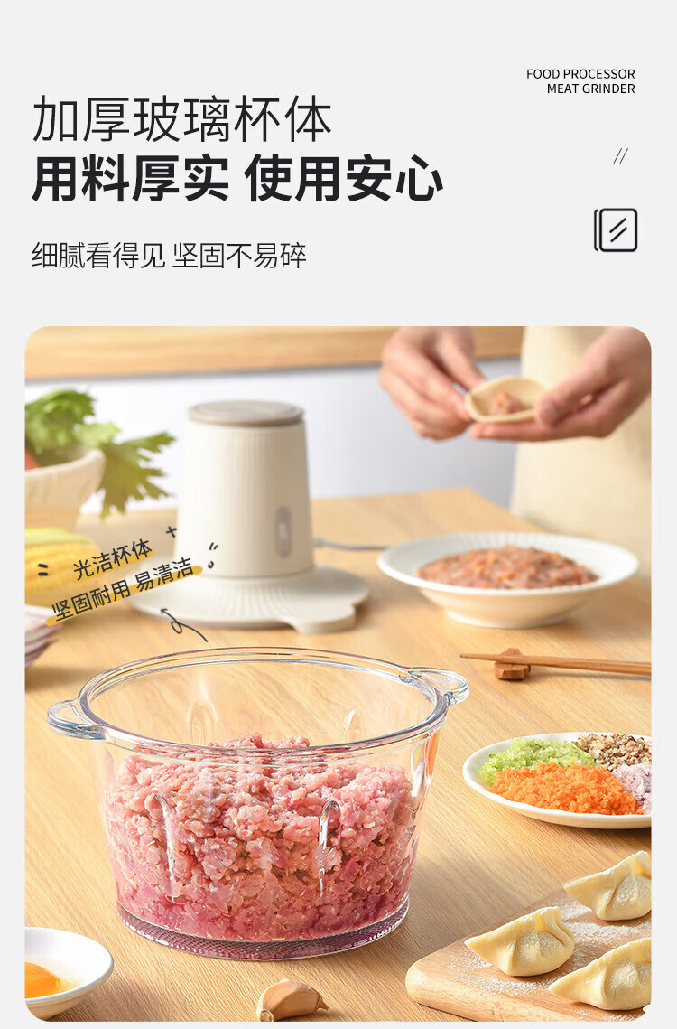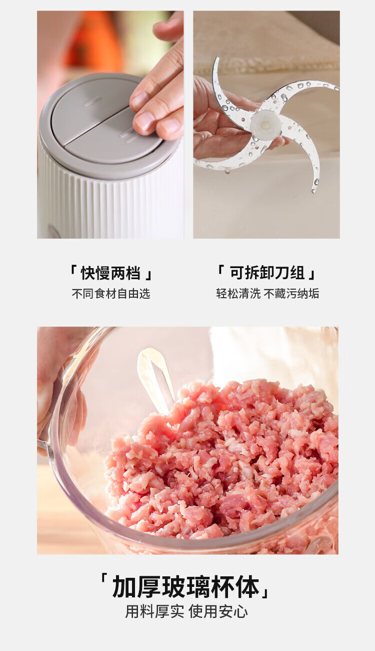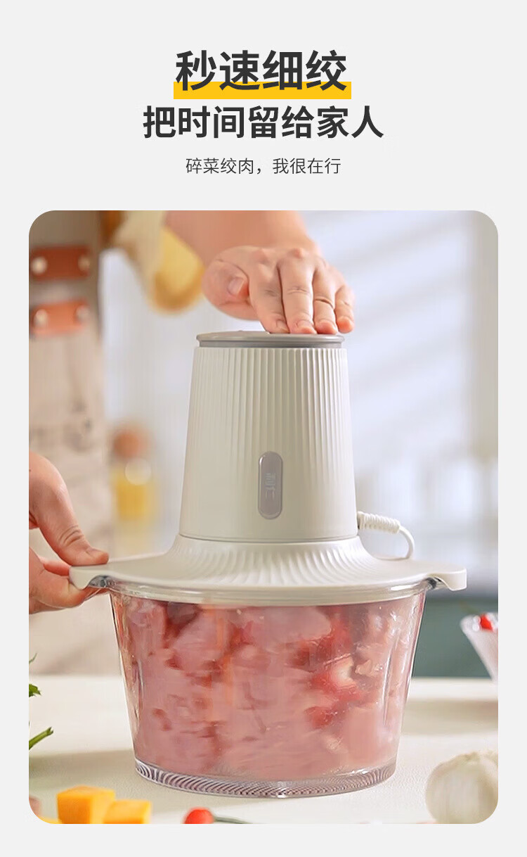 250W,28000转高速运转,约6秒可出肉馅;上层初步切碎、下层精细打磨;支持绞肉、搅拌、制作辅食、蒜泥等多种食材处理